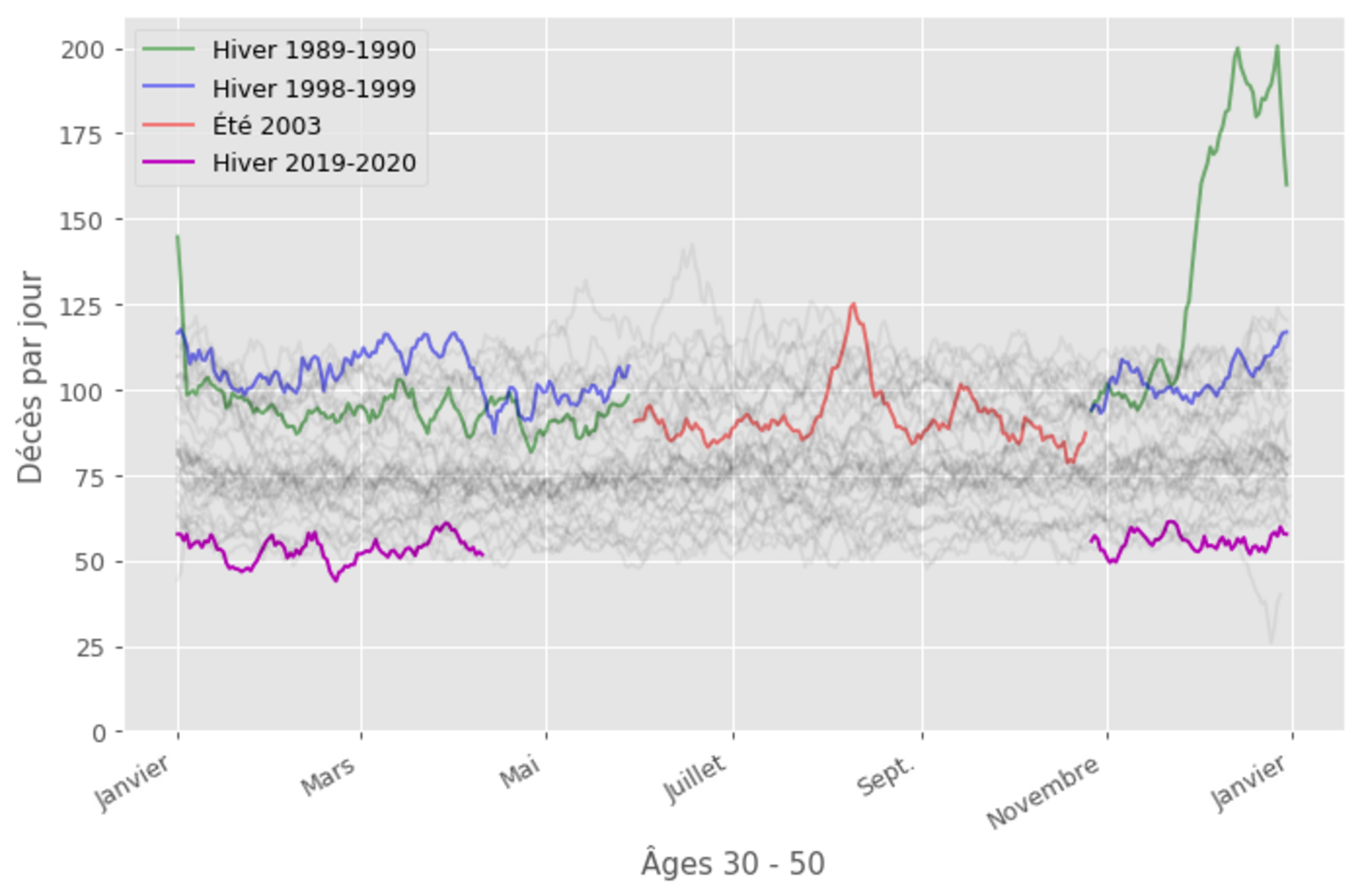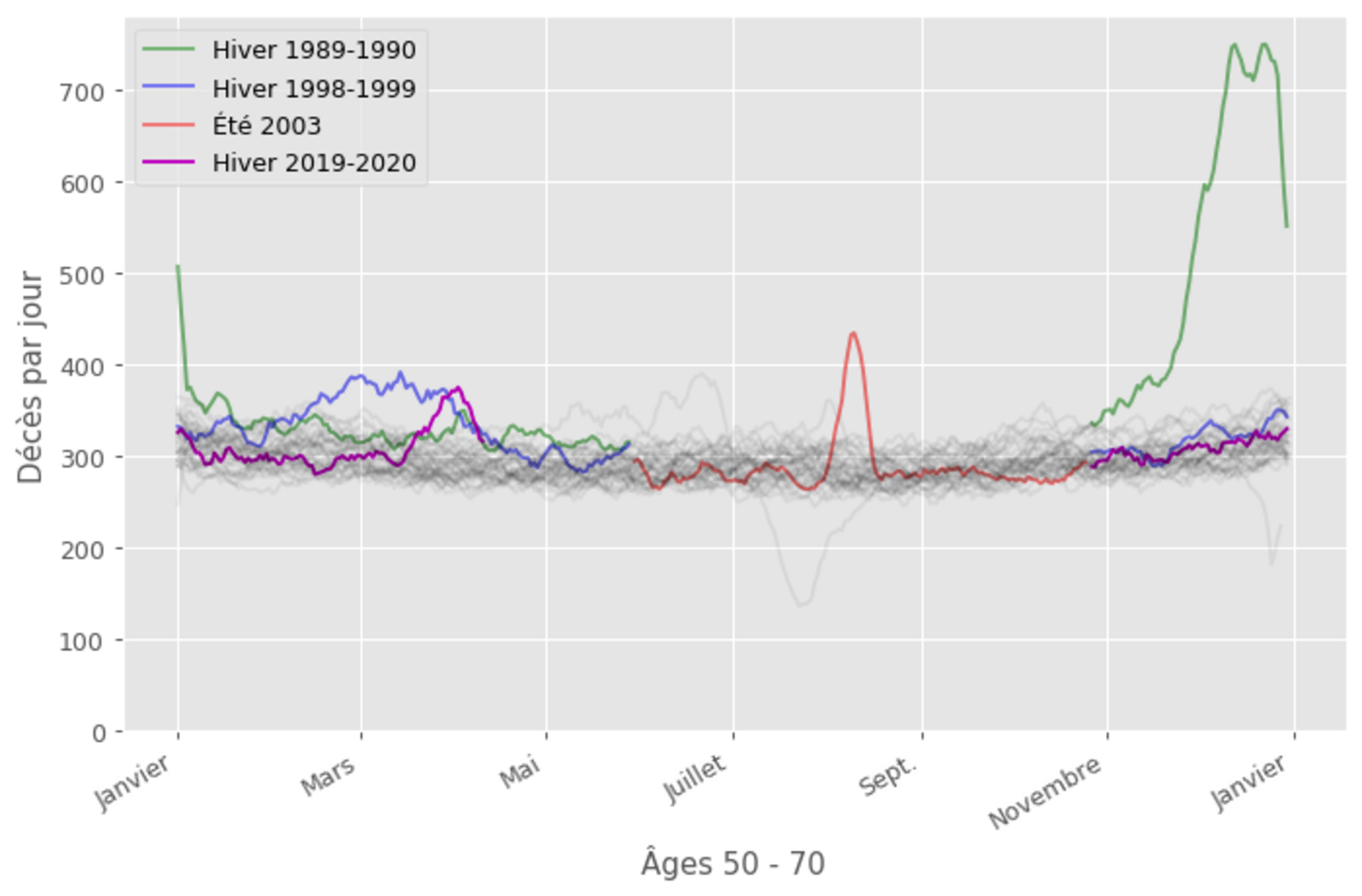 Dans le graphe ci-dessus, on voit un pic très net en rouge en août, qui correspond à la canicule de 2003. La surmortalité a été de presque 100% pendant quelques jours.