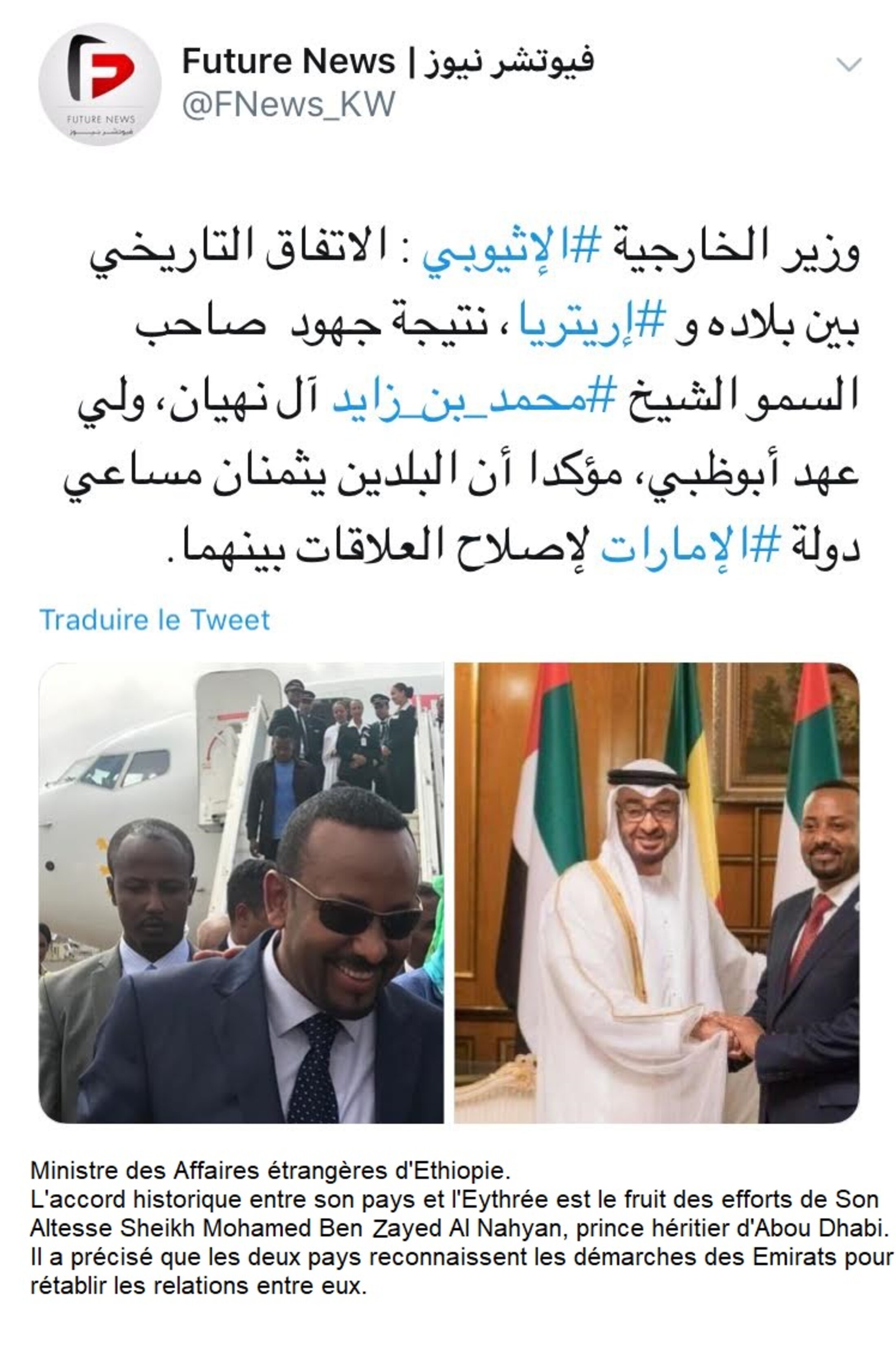 Cette paix retrouvée, longtemps désirée par les peuples des deux pays, doit beaucoup à l’implication du prince hériter d’Abou Dhabi, Mohamed Ben Zayed Al Nahyan. Et c’est le ministre éthiopien des Affaires étrangères qui le confirme dans un tweet dans lequel il souligne que les deux pays sont reconnaissants envers les Emirats arabes unis pour les efforts qu’ils ont déployés pour rétablir les relations ente eux.