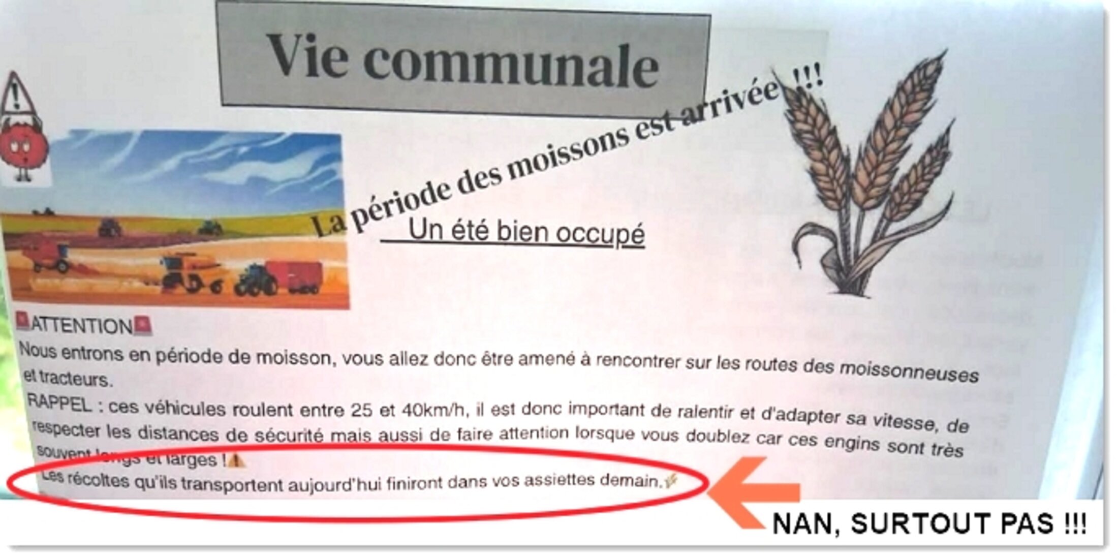 Tout comme il peut exister – j’en ai entendu parler à la télé –  des Israélien(ne)s honnêtes, respectueux(euses) de la parole donnée et de la tranquillité de leurs voisins, des Israéliens qui ne cultivent ni ne transmettent à leurs enfants la haine et le mépris de l’Arabe (et du goy en général), il peut exister ça et là (entre Orléans et Rambouillet disons) un(e) agriculteur(e) céréalie(è)r(e) soucieux(se) de son environnement et surtout du bien-être des populations au milieu desquelles ses congénères moins bien intentionné(e)s évoluent façon seigneur(e)s féodaux(ales), distribuant tronches renfrognées et regards lointains du haut de leurs tracteurs-bulldozers. S’iel existe, iel se cache drôlement bien !