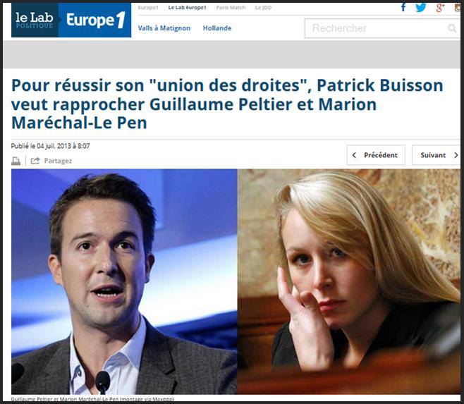- Il est apparu, en outre, que Guillaume Peltier, ancien adhérent du FN, très proche de Jean-François Copé, fondateur de la « droite forte » que Patrick Buisson se verrait bien rapprocher de Marion Maréchal Le Pen (http://lelab.europe1.fr/pour-reussir-son-union-des-droites-patrick-buisson-veut-rapprocher-guillaume-peltier-et-marion-marechal-le-pen-9760), a été aidé par le même Bastien Millot et Bygmalion à fonder sa propre société de communication, Com1+(http://rue89.nouvelobs.com/2014/06/01/meler-business-politique-a-lump-guillaume-peltier-assure-releve-252554).