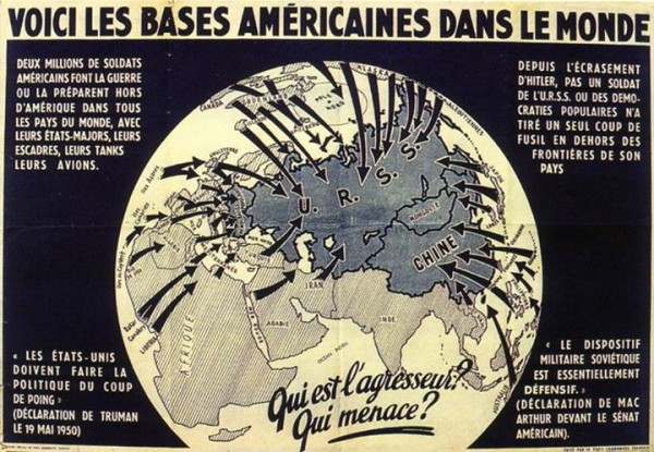 - Ci-dessus : Affiche du PCF de 1950 : « VOICI LES BASES AMÉRICAINES DANS LE MONDE». Cette affiche du Parti communiste français prouve à quel point ce parti n'hésitait pas, dans les années 50, à présenter les enjeux géopolitiques aux électeurs, qu'il jugeait suffisamment intelligents et adultes pour les comprendre.