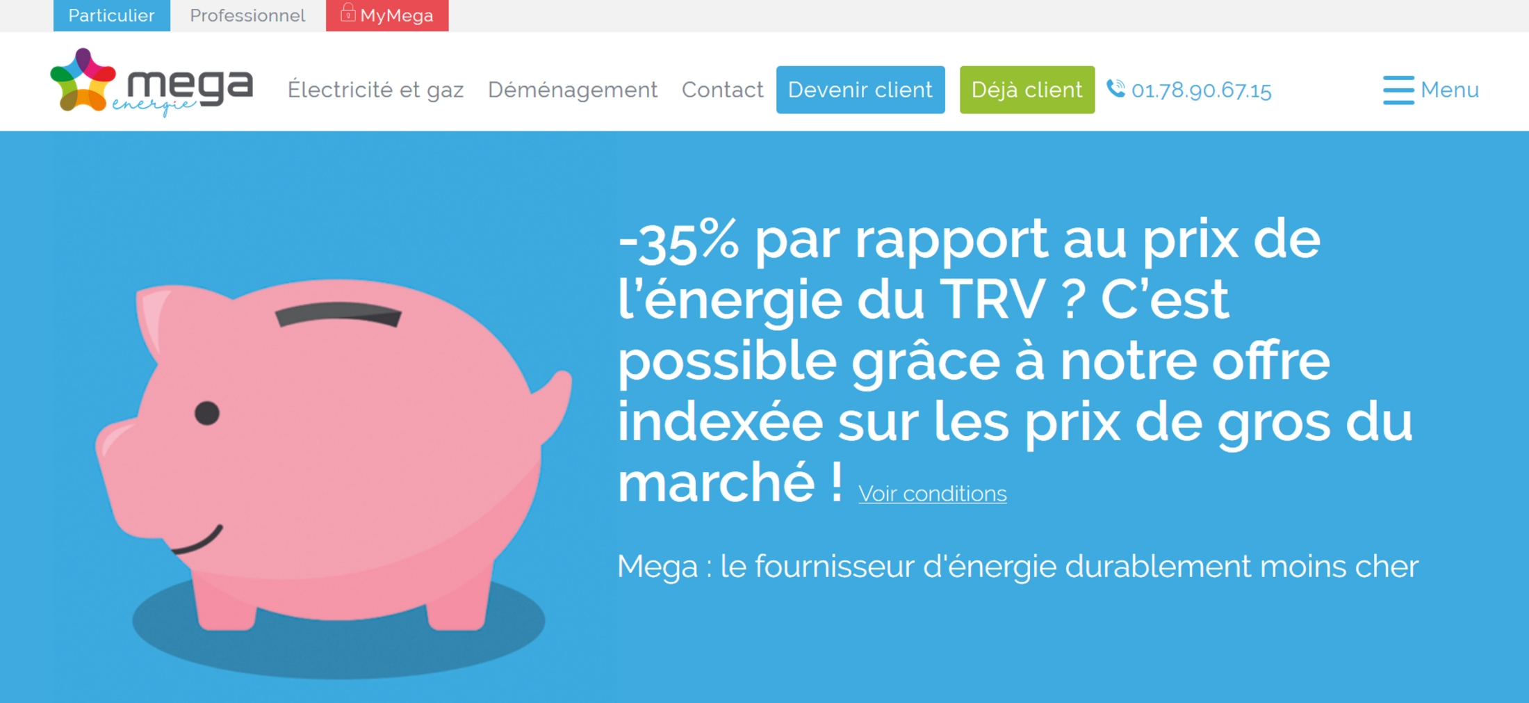 L'offre de MEGA Energie est annoncée, sur son site internet, dès la page d'accueil, comme permettant près de 35% de remise accompagné du commentaire "Mega : le fournisseur d'énergie durablement moins cher"
