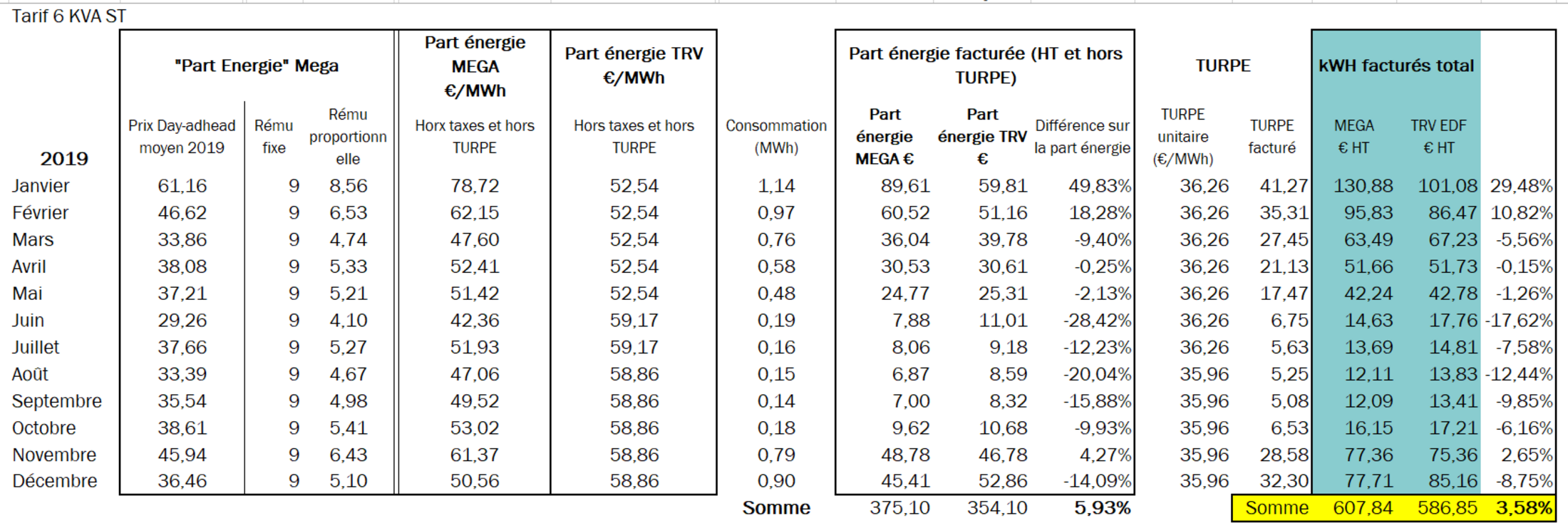 Il apparait de manière incontestable que, pour l'année 2019, le recours à l'offre indexée selon la formule de Méga énergie aurait conduit à une facturation de la part énergie HT près de 6% plus chère qu'au tarif réglementé d'EDF. Une fois le TURPE ajouté (somme fixe), l'écart sur la facture est de 3,58% en faveur du tarif réglementé. C'est typiquement une mauvaise affaire pour le consommateur, pour cette année là en tous cas. Cela ne préjuge pas des résultats futurs.