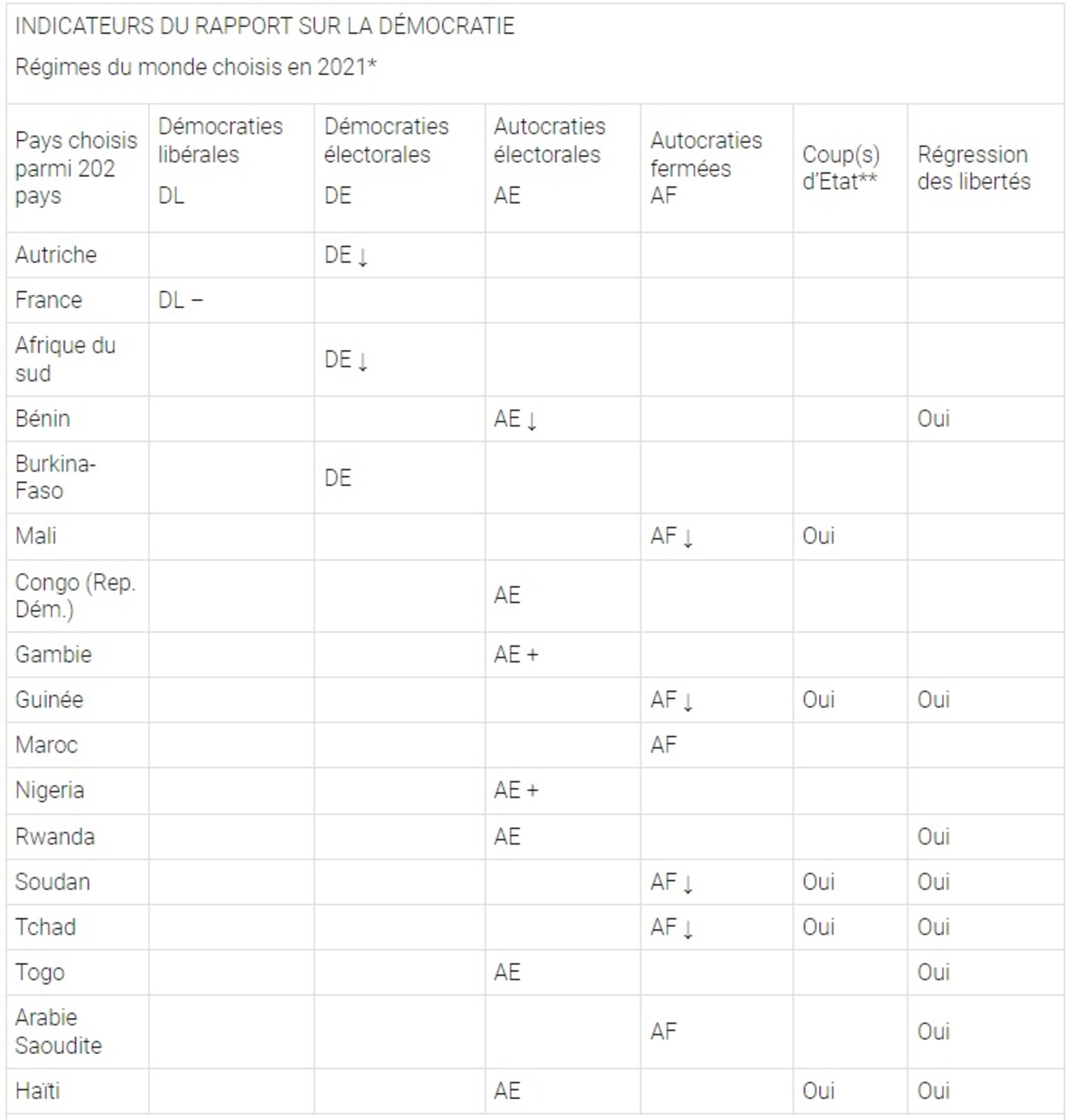 Notons tout de même dans ce Rapport qu’à peine 3 % de la population mondiale ont pu expérimenter une phase de démocratisation en 2021. Selon le Rapport sur la Démocratie, le processus de démocratisation ou de régression vers l’autocratie n’est pas un phénomène spécifique à l’Afrique et que les 15 pays qui se démocratisent et les 32 qui s’autocratisent se retrouvent dans toutes les régions du monde [18].