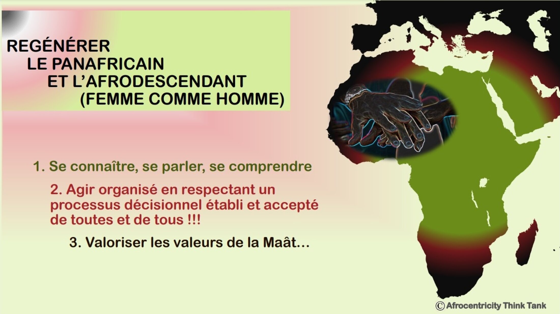 Le processus devant conduire à l’avènement du panafricanisme consiste d’abord à retrouver l’indépendance individuelle et collective, l’autonomie, la souveraineté, la liberté, le pouvoir et le droit de choisir sa destinée en se réappropriant la trajectoire historique et du bonheur rappelés par les ancêtres divinisés et le Dieu primordial des peuples premiers. En effet, nul ne peut mieux comprendre les problèmes des Africains et de sa Diaspora que les Noirs et les Africains et d’ascendance africaine y compris les métis et les mulâtres. La gouvernance postcoloniale fondée sur le paternalisme, la spoliation et la condescendance ne perdure que parce qu’il existe encore trop de dirigeants africains, publics comme privés, adeptes de cercles ésotériques dominés par le monde occidental blanc, qui orchestrent en Afrique et partout où les missions leurs sont confiées, d’exclure ou de ridiculiser toutes les Africaines et tous les Africains conscients y compris dans la Diaspora, des enjeux mondiaux et plus particulièrement des enjeux d’inversion des rapports de force que sous-tend le mouvement panafricain.