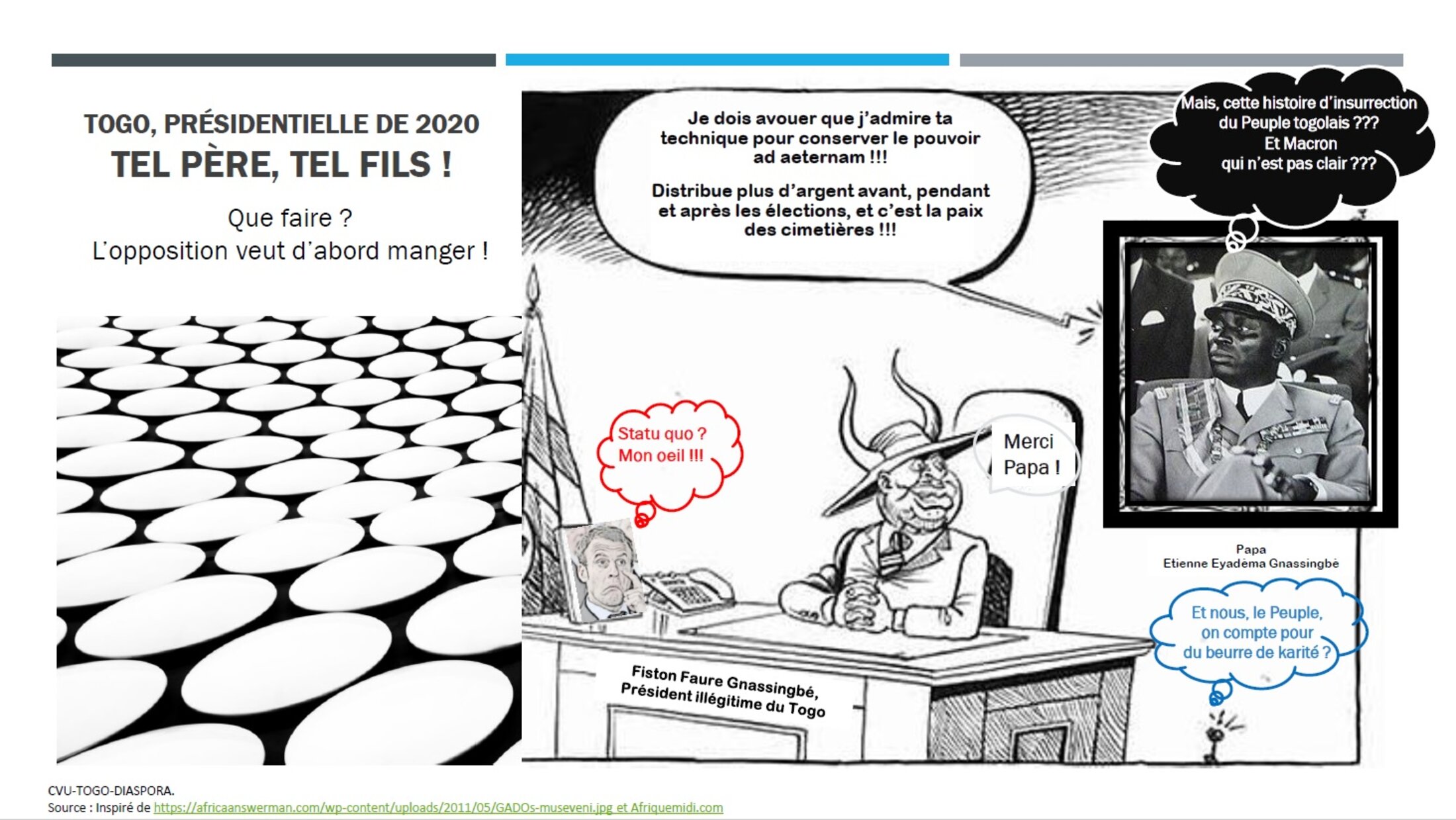 Le système actuel du RPT/UNIR est organisé pour offrir une fausse image de la démocratie à la communauté internationale. Pour ce faire il faut absolument empêcher toutes formes de contestations de type insurrectionnel, mais accepter, voire susciter habilement, celles qui permettent de légitimer Faure Gnassingbé et son système. Ce système d’achat des consciences des dirigeants du RPT/UNIR comme ceux d’une opposition institutionnelle, a permis d’avoir déjà plus de 11 candidats déclarés pour l’élection présidentielle de 2020, fondée sur des réformes électorales effectuées de manière unilatérale sans concertation et donc sans consensus, donc non transparentes et opaques, imposées par le pouvoir. L’objectif affiché, avec l’appui des chancelleries légitimatrices - africaines comme occidentales -, est de présenter l’image de Faure Gnassingbé, comme celle d’un démocrate. En fait un « faux démocrate » car au service exclusif de la classe qui dirige et des multinationales qui ont des intérêts au Togo, au détriment de l’intérêt général du peuple togolais. Dès lors, les manifestations sont réprimées, empêchées ou réduites à ne plus avoir de capacité de nuisance politique pour le pouvoir. La démocratie dite « apaisée » du Togo trouve même des légitimateurs au sein des responsables religieux, qui vendent leur droit d’aller au paradis contre la paix des cimetières au Togo… Ceux qui ont choisi de jouer ce jeu sont non seulement des légitimateurs du statu quo du système mais des traitres envers le Peuple togolais. La vérité est que le Peuple togolais indépendant ainsi que sa Diaspora plurielle indépendante, n’ont jamais demandé d’aller à des élections de la contrevérité des urnes.
