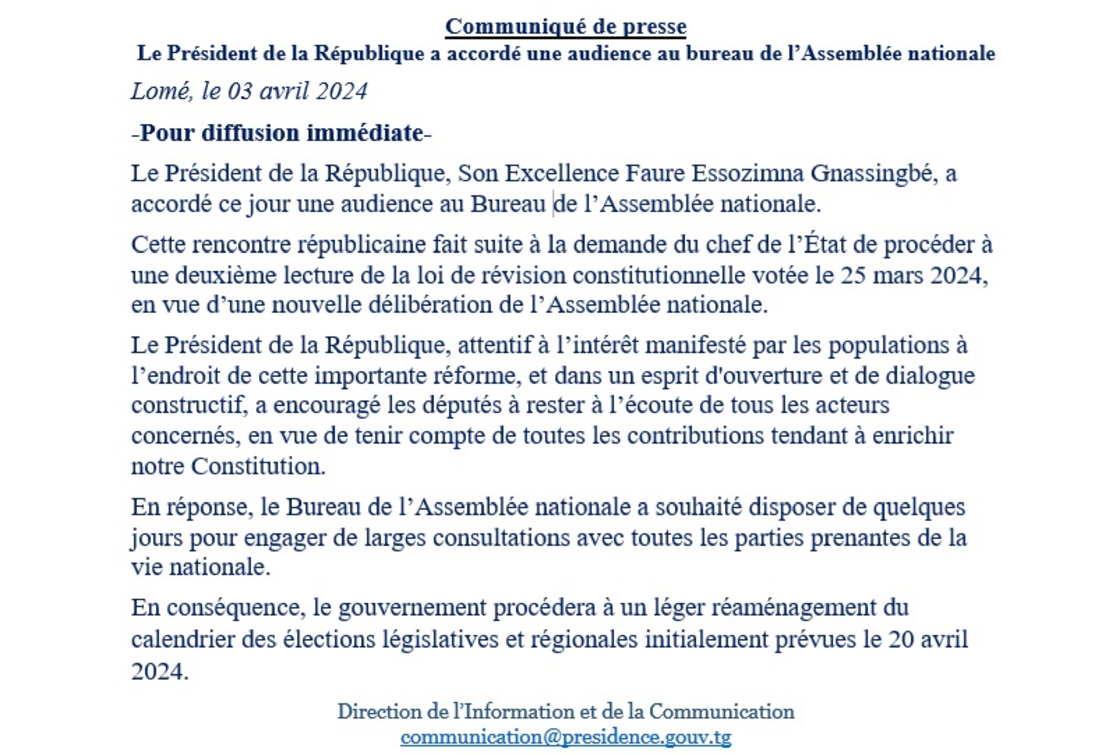 Quelque peu ébranlé Faure Gnassingbé reporte sine die les élections législatives et régionales prévues le 20 avril, comme en témoigne le communiqué publié par la présidence de la république du Togo le 3 avril 2024 qui annonce le report du scrutin, sans pour autant préciser une nouvelle date, ce qui relève des prérogatives du gouvernement à qui incombe l’organisation du scrutin.