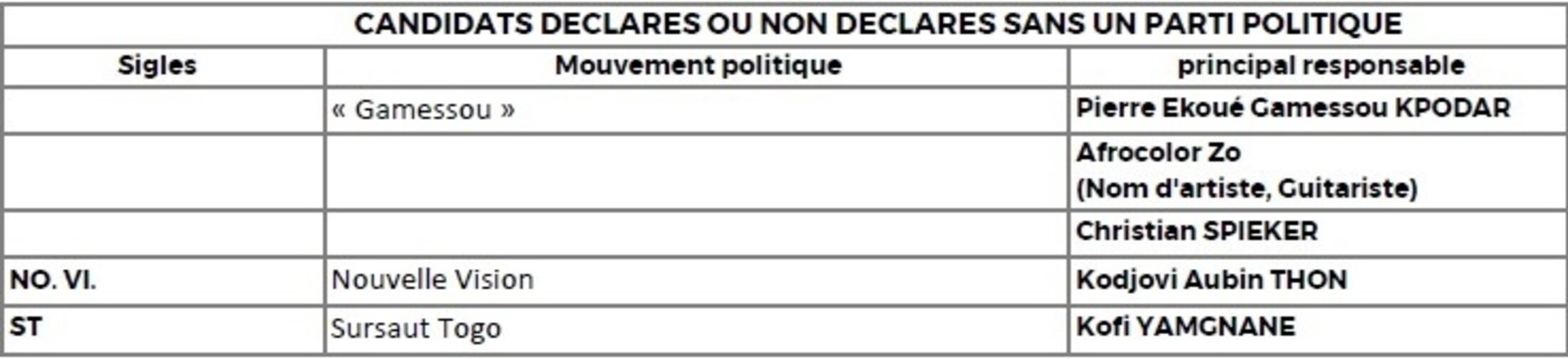 Il importe de noter qu'il existe des candidats sans partis politiques ou en voie de constitution. A ce titre, il importe de noter la présence de nouveaux candidats.