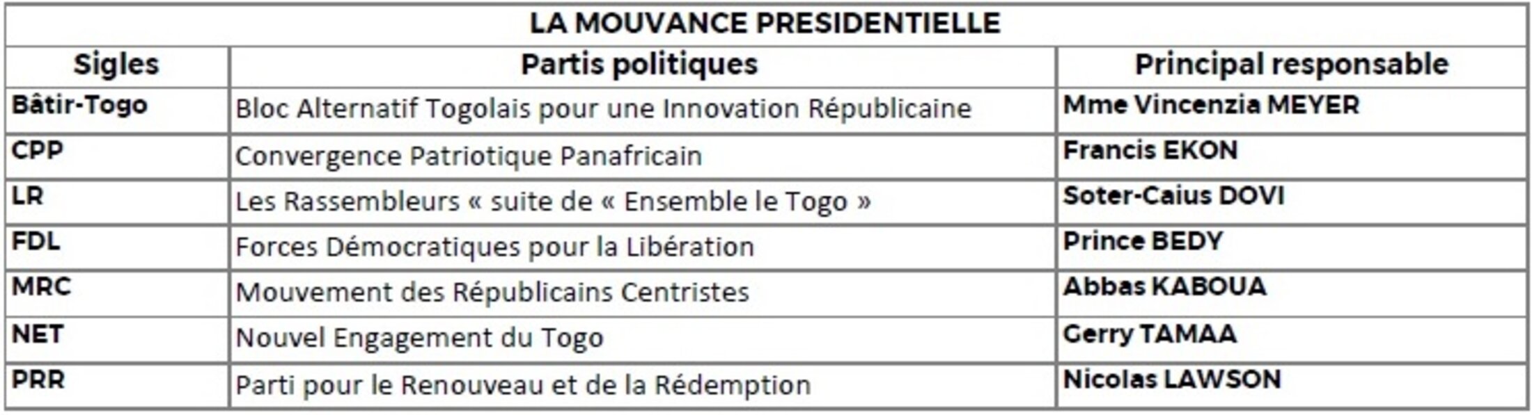 Il est d'abord très important de ne pas tomber dans le piège de la multiplication des partis qui soutiennent le Rassemblement du Peuple Togolais devenu l'Union pour la République de Faure Gnassingbé. En effet, ce n'est pas parce que les responsables des partis politiques ont parfois des notes verbales critiques qu'ils ne sont pas en fait stratégiquement en accord avec le parti qui domine illégitimement la vie politique togolaise depuis près de 60 ans. Les citoyens togolais sont invités à compléter la liste ou à l'ajuster en fonction de leur expérience avec les dirigeants de ces partis politiques. C'est ainsi que la mouvance présidentielle se présente actuellement. Il n'est donc pas étonnant que ces partis politiques soient clairement positionnés pour soutenir la multiplicité des candidatures pour faciliter la victoire de Faure Gnassingbé au premier tour des élections présidentielles de 2020, ou alors de le soutenir au deuxième tour dans le cadre de la non-transparence des résultats des urnes. Le tableau de la mouvance présidentielle présumée se présente comme suit au mois de novembre 2019.