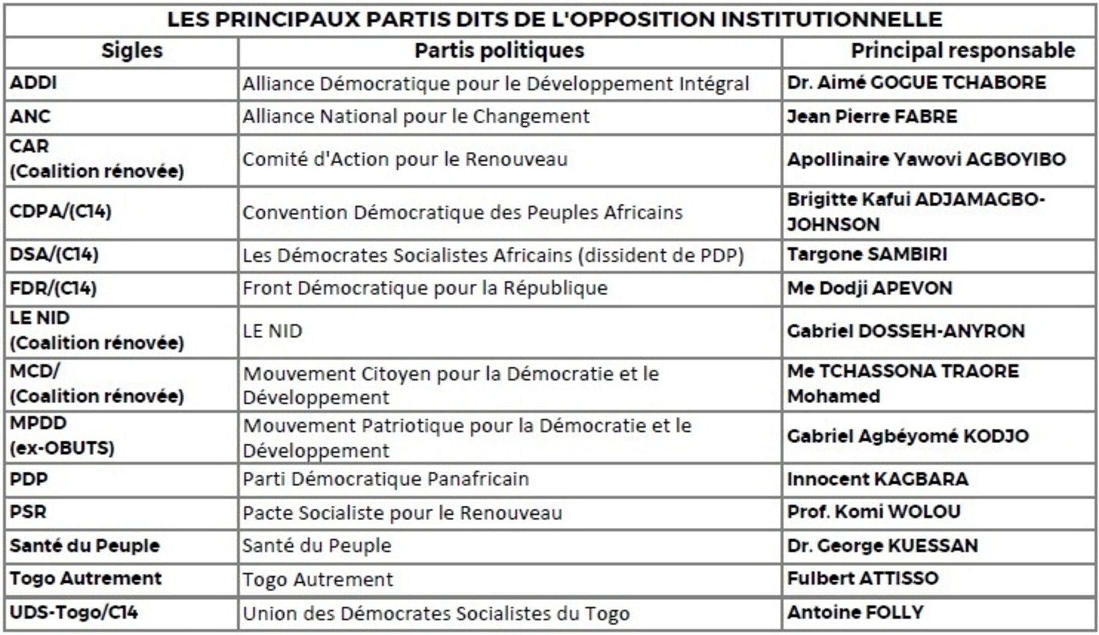 En face, il existe une opposition institutionnelle car comme chacun a pu le constater avec la Coalition des 14 partis politiques, il était impossible pour des raisons officiellement inconnues, de faire évoluer cette coalition vers un chiffre plus important alors que le Togo aurait au moins 117 partis politiques enregistrés. Aussi, les partis politiques considérés comme relevant de l'opposition togolaise se présentent comme suit :