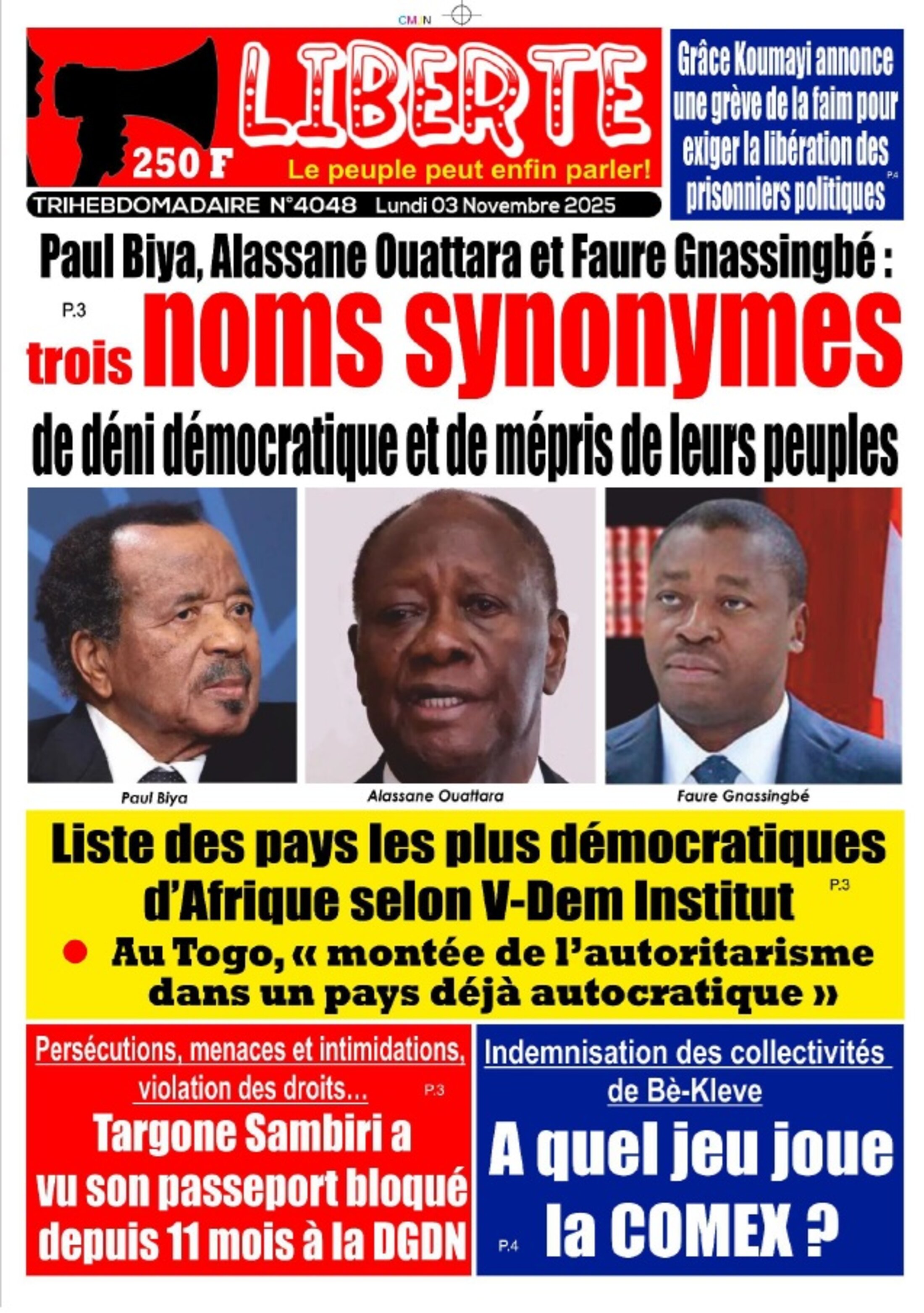 Une du n°4048 du 3 novembre 2025 du journal Liberte, trihebdomadaire du-Togo