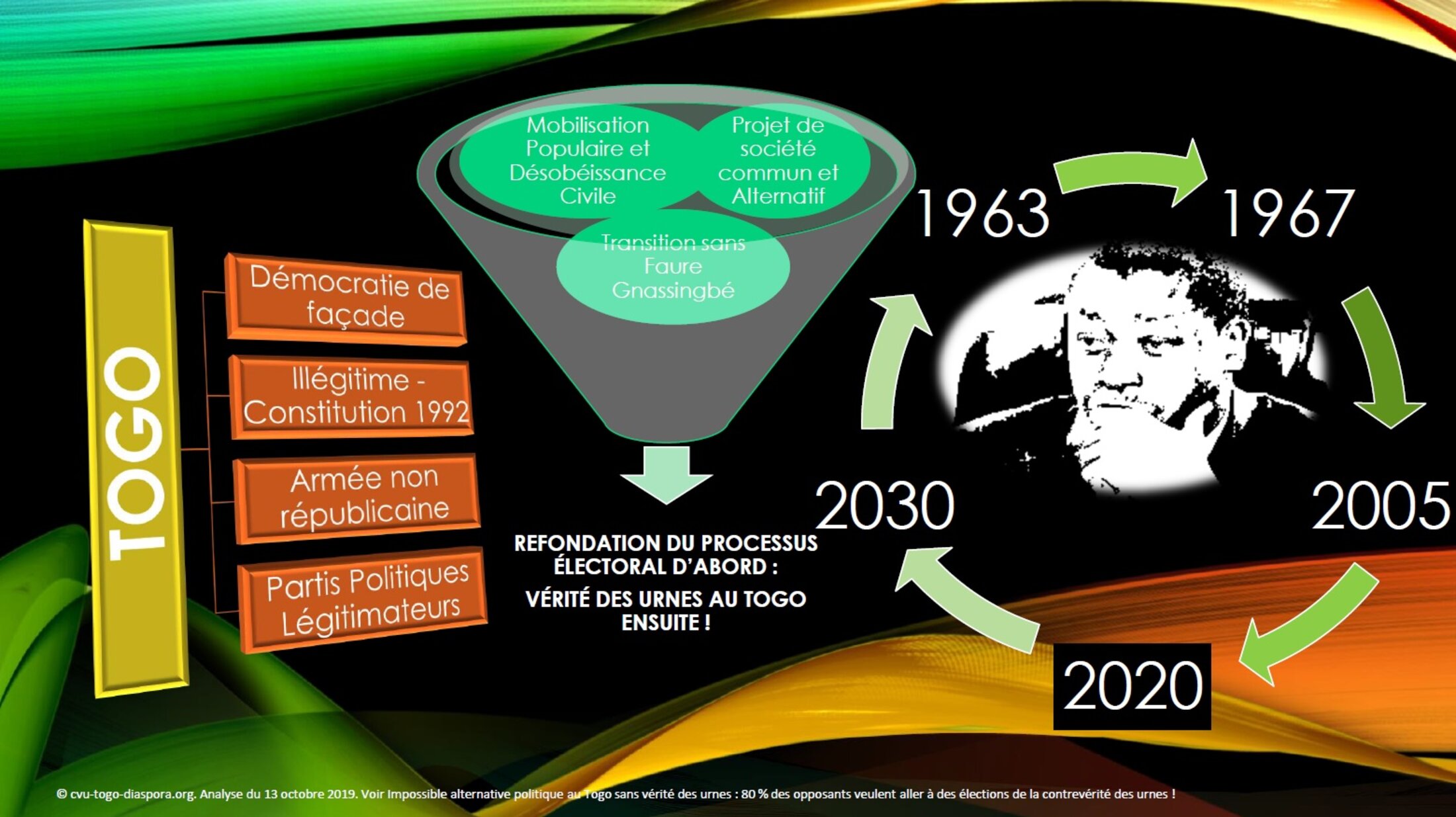 En définitive, il ne pourra pas y avoir d’alternative politique au Togo sans l’organisation du processus électoral permettant l’expression sans entraves de la vérité des urnes. . Le problème est que 80 % des responsables dits de l’opposition togolaise veulent aller à des élections de la contrevérité des urnes !