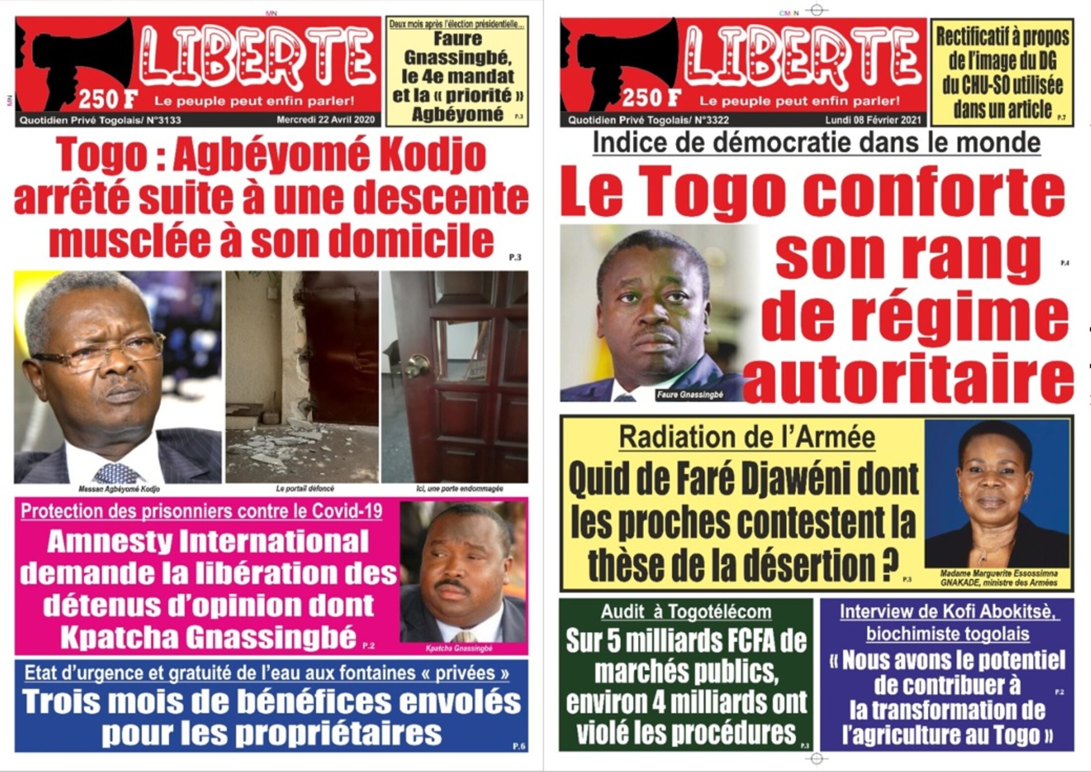 La une du quotidien Liberté du 22 avril 2020 reprend un communiqué d'Amnesty International qui demande la libération des détenus d'opinion, dont Kpatcha Gnassingbé