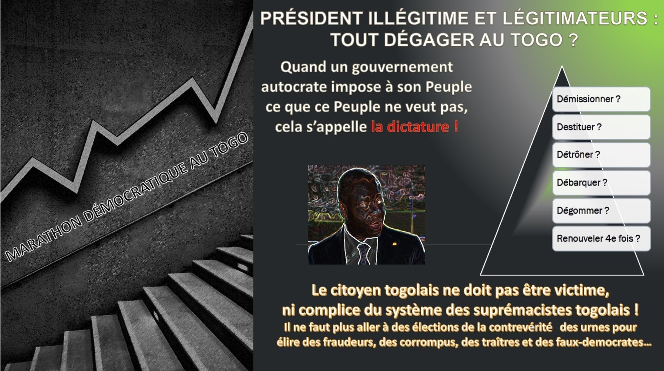 Le Peuple togolais refuse de comprendre que le Togo est devenu la propriété de Faure Gnassingbé et d’une extrême minorité qui adhère au système politico-économique qu’il propose et qu’il dirige illégitimement depuis quinze ans, à la suite de son père Étienne Eyadema Gnassingbé. Le Peuple togolais doit se poser la question de savoir ce que ce système illégitime pourra lui apporter en plus ou en moins, s’il perdure encore durant les cinq années de mandature entre 2020 et 2025.