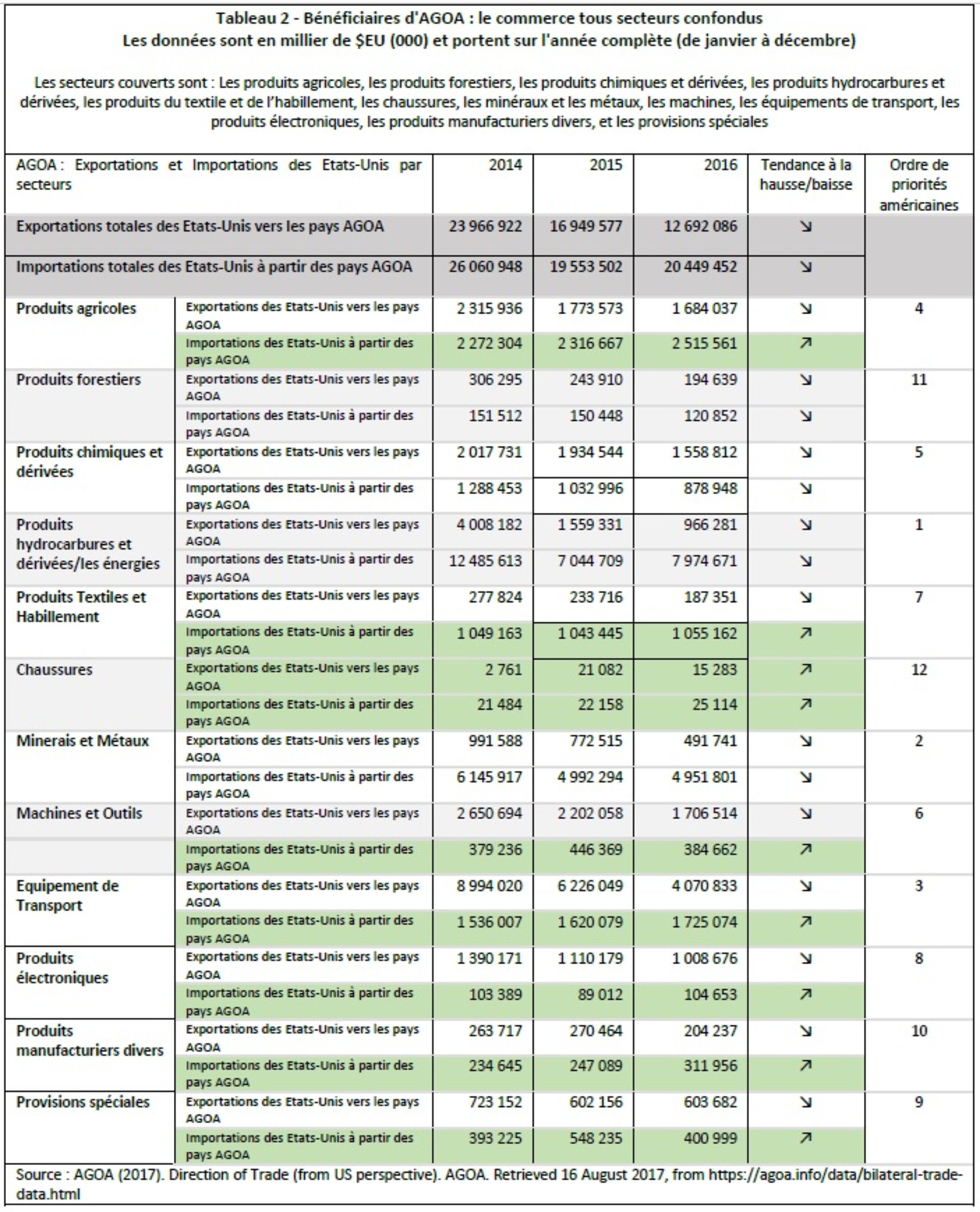 Si on devait s’attarder sur les désagrégations par principaux secteurs, il faut se rendre à l’évidence que la baisse structurelle des échanges sous AGOA se confirme à tous les niveaux. Il y a donc bien un véritable problème avec les objectifs réels poursuivis par les tenants de l’AGOA et une incompréhension de la part des dirigeants africains à ne pas tenter de renégocier les conditions AGOA en tenant compte de leur niveau de développement industriel individuel et collectif (voir le tableau 2).