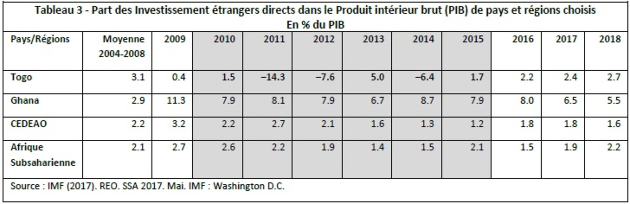 Aussi, tant que cet environnement des affaires perdurera, il sera difficile de voir les relations commerciales et d’investissement avec les Etats-Unis contribuer à l’amélioration des capacités productives et une amélioration de la valeur ajoutée manufacturière (VAM) des pays africains. Rappelons tout de même que le niveau des investissements étrangers directs (IED) au Togo a évolué en dents de scie entre 2014 et 2017 (voir tableau 3 ci-après). En comparaison, la part des IED des pays voisins (Bénin et Ghana) ou même de l’Afrique subsaharienne dans le produit intérieur brut (richesse produite) au cours de la même période témoigne de la difficulté pour certains investisseurs de choisir le Togo comme une destination stable malgré un code d’investissement et une zone franche attractive. La réalité des pratiques de l’environnement des affaires sur le terrain et les coûts de transaction ne sont pas compétitifs 19 notamment au cours du 2e mandat présidentiel de Faure Gnassingbé (voir tableau 3 ci-après).