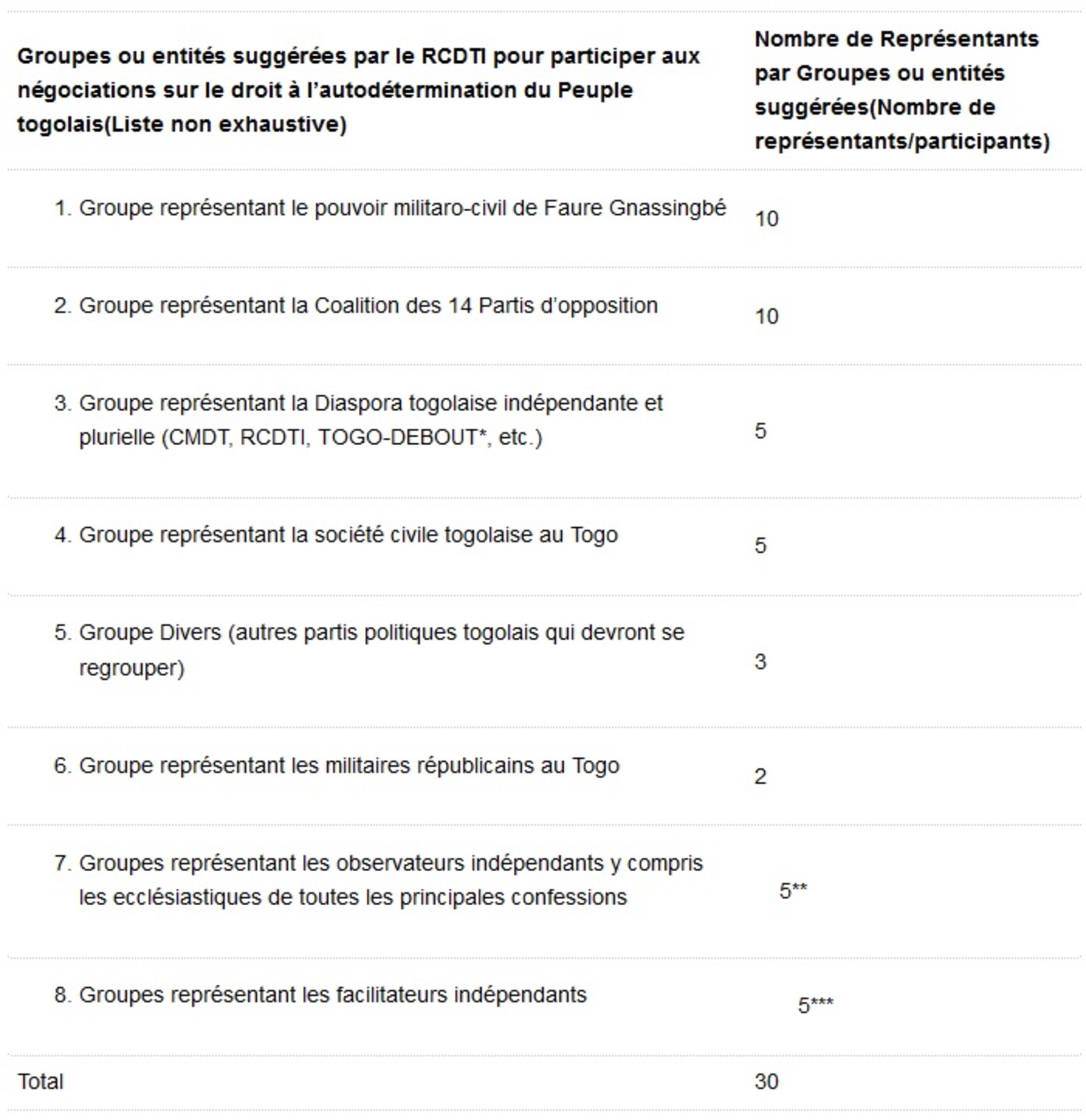 GROUPES DEVANT PARTICIPER AUX NÉGOCIATIONS TOGOLAISES POUR LE RETOUR DU DROIT À l’AUTODÉTERMINATION DU PEUPLE TOGOLAIS (SUGGESTIONS DU RCDTI)