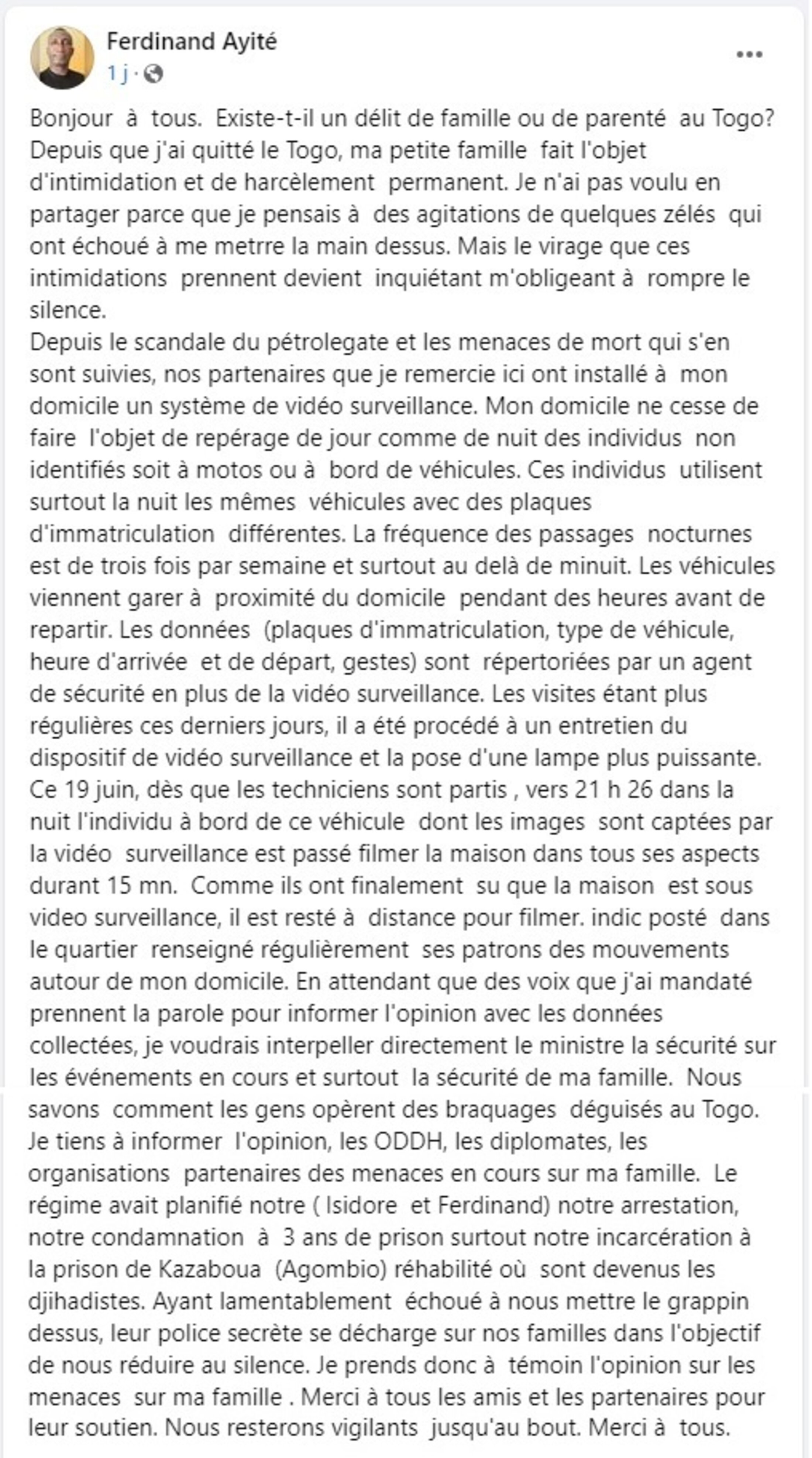 Nous savons comment les gens opèrent des braquages déguisés au Togo. Je tiens à informer l'opinion, les ODDH, les diplomates, les organisations partenaires des menaces en cours sur ma famille.
