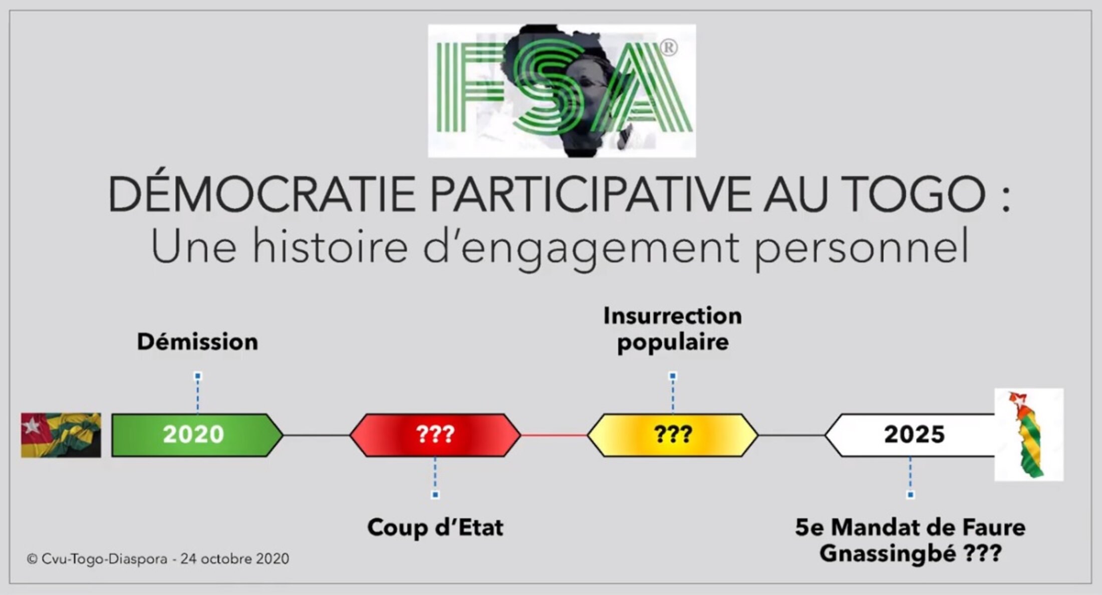 Au moins, nos propositions seront disponibles en cas de démission, de coup d’Etat, d’insurrection populaire ou lorsque le 4e mandat de 5 ans usurpé de Faure Gnassingbé se terminera en 2025. Le peuple ne pourra plus dire qu’il n’y avait pas au moins une politique alternative innovante face à la pratique de l’arbitraire du système au pouvoir.