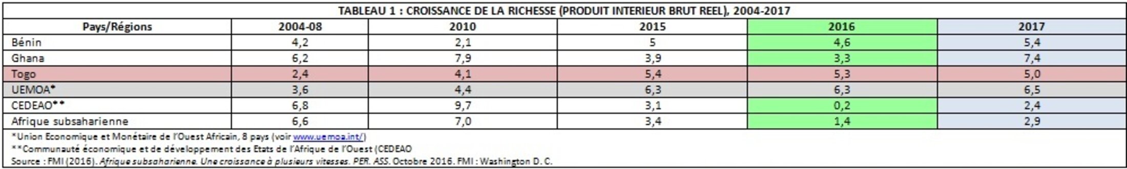 Il importe de lire ce tableau sous l’angle de la croissance de cette richesse par habitant. Bien qu’il s’agisse de moyenne, les progrès économiques au Togo passant de -0,7 % de croissance économique par habitant entre 2004-08 à 2,5 % en 2016 n’est pas palpable au niveau des populations. Mieux que le Ghana, le Bénin, la moyenne de la CEDEAO de l’Afrique subsaharienne en 2016, le Togo peine à se propulser au-dessus de la moyenne de la sous-région francophone qu’est l’UEMOA avec 3,4 %, voir le Tableau 2.