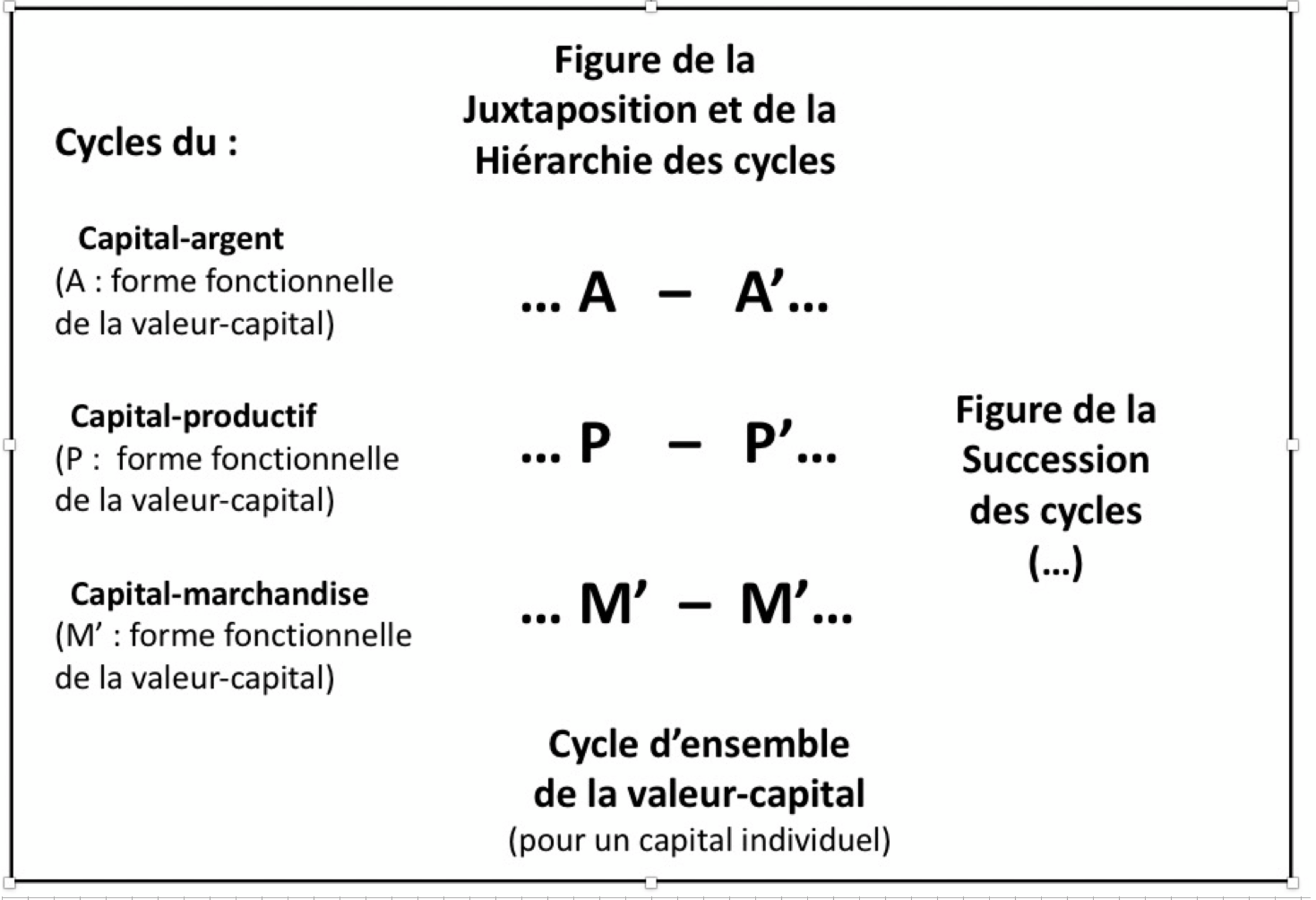 Pour Marx, il est clair que le cycle attaché au capital argent, soit A-M…P…M’-A’, ou A-A’ pour simplifier, est central dans le cycle d’un capital individuel. (c’est du reste le titre du chapitre 1 du livre II, « le cycle du capital argent », voir l’annexe).