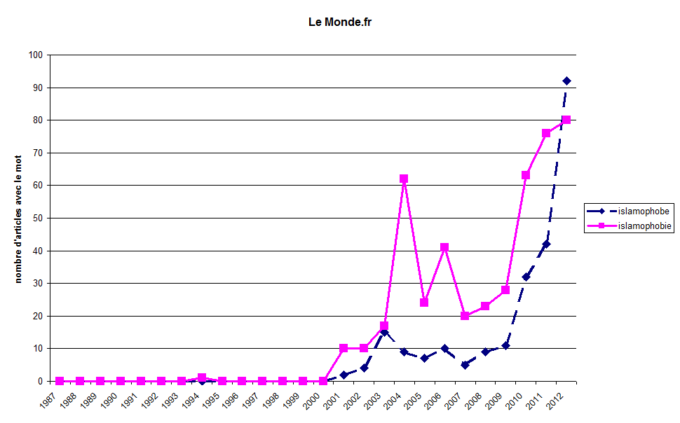 Pour éviter toute discussion oiseuse sur la fréquence d'emploi du mot, des statistiques brutes : les fréquences d'emploi des mots islamophobe et islamophobie dans "Le Monde", de 1987 à 2012.
