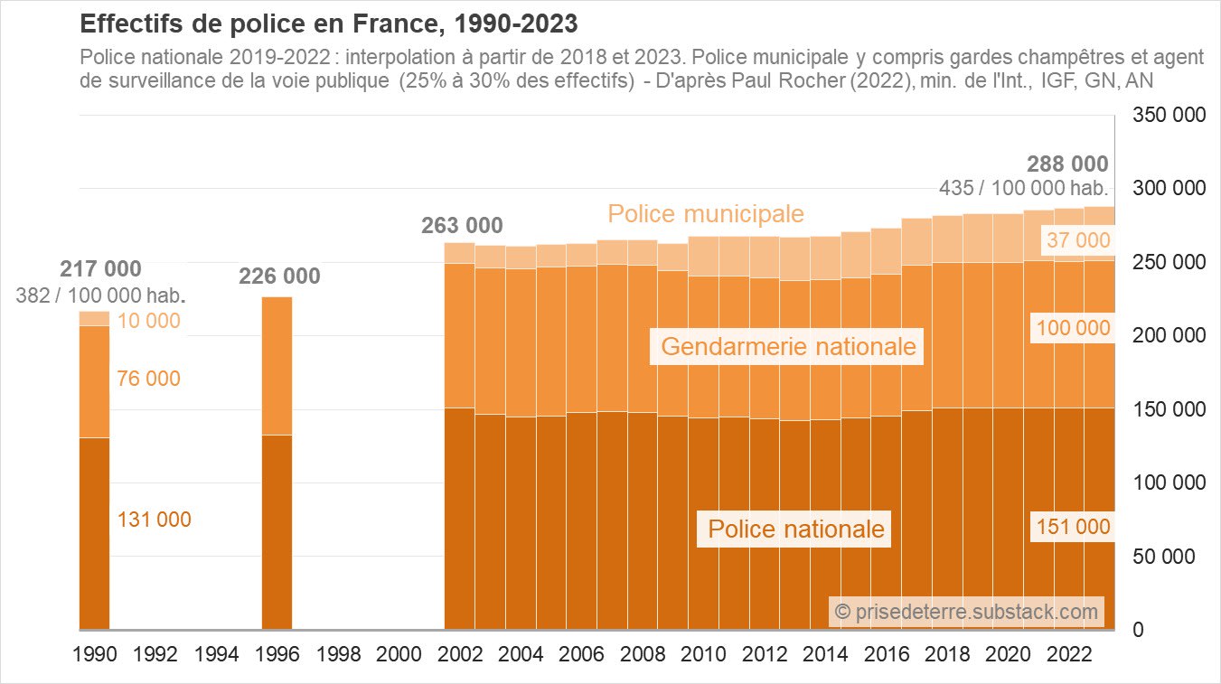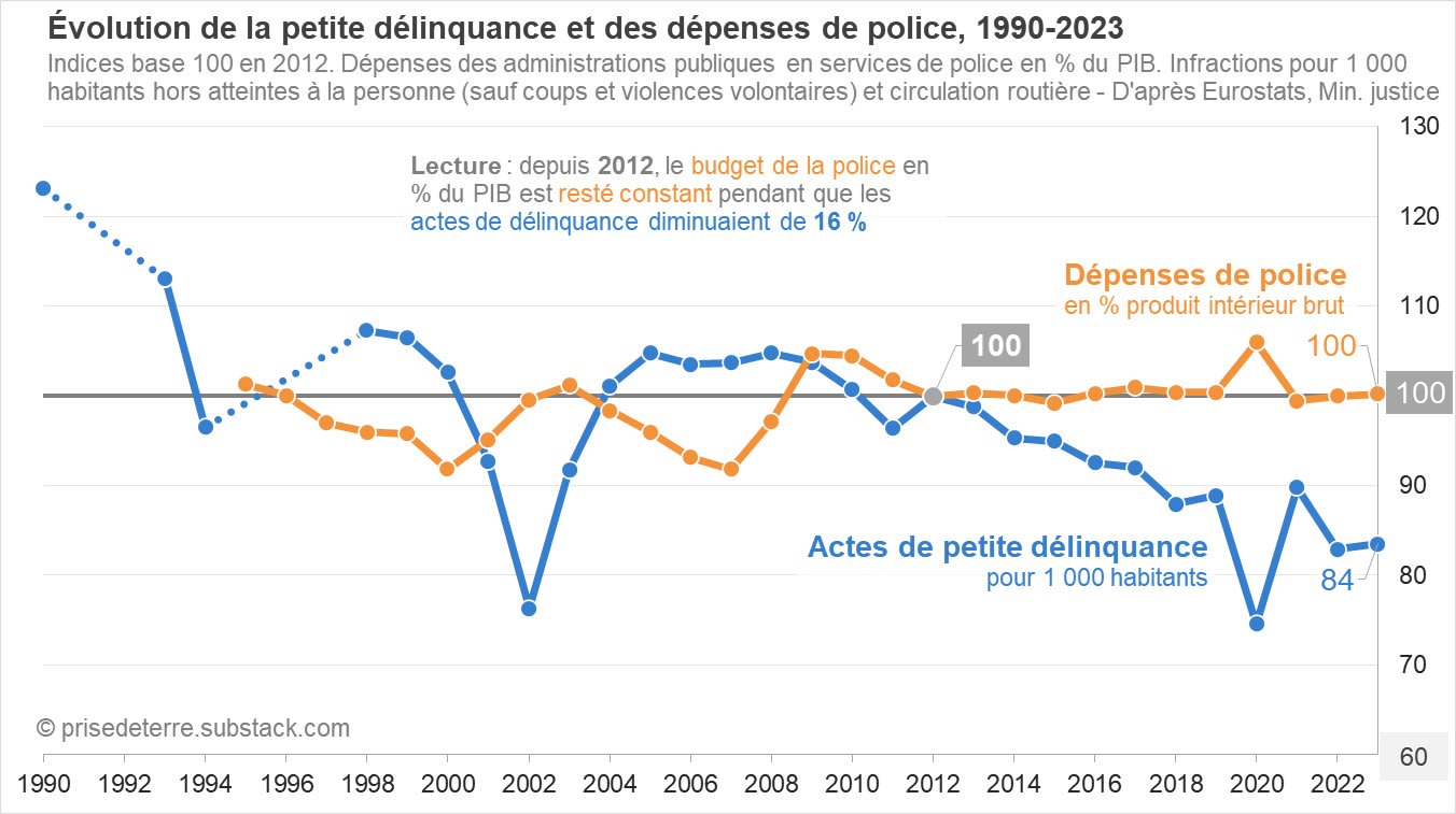 Cette emprise policière a bénéficié également de l’explosion des polices municipales (le nombre de ses agents et assimilés a plus que triplé entre 1990 et 2020), de l’essor des entreprises de sécurité privée (170.000 agents aujourd’hui), mais également de la “société de vigilance”, c’est à dire de l’ensemble des incitations que reçoit la population pour surveiller autrui (logiques de dénonciation, discours sur l’ennemi intérieur, etc.). On pourrait difficilement faire plus sans fragiliser durablement nos finances publiques et basculer dans un autre régime…