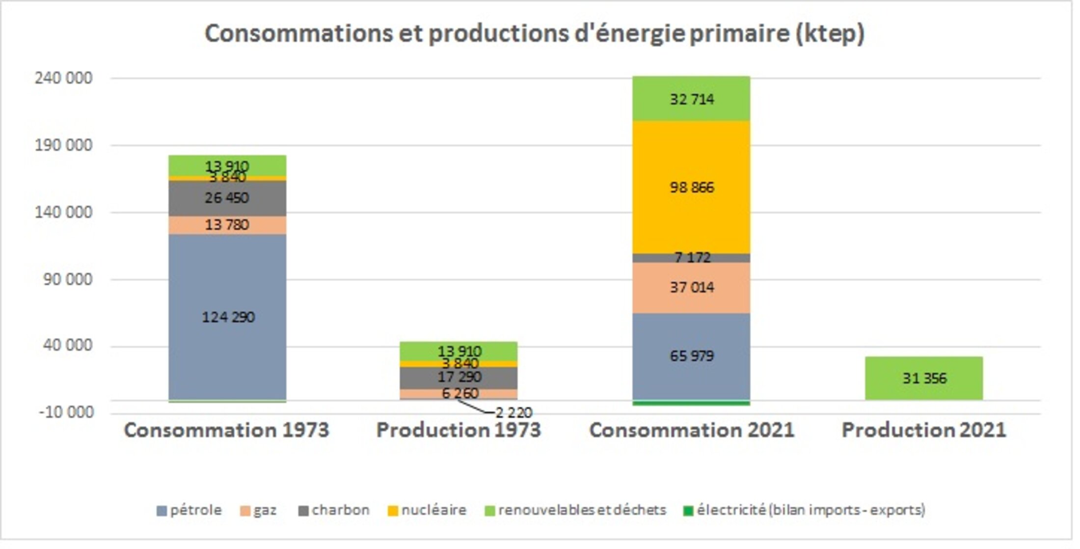 Entre 1973 et 2021 la consommation d’énergie primaire a très fortement augmenté. Pourtant la consommation d’énergie finale n’a pratiquement pas bougé (voir paragraphe suivant) et la production par les énergies renouvelables a plus que doublé. La réduction de consommation d’énergies fossiles a été plus qu’effacée par la consommation d’énergie nucléaire.