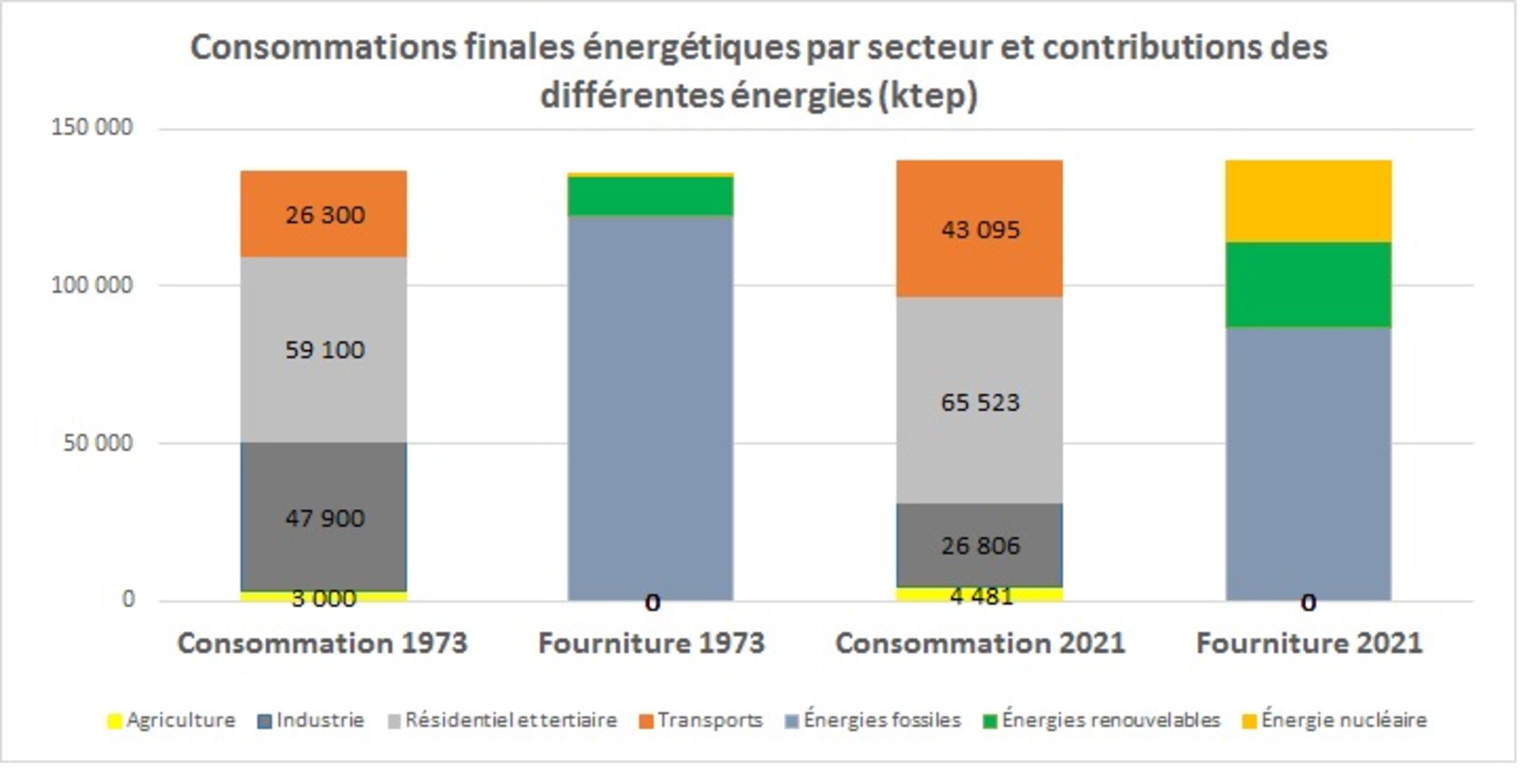 On peut observer qu’entre 1973 et 2021, la réduction de consommation du secteur industriel a été complètement effacée par l’augmentation de la consommation des transports et du résidentiel-tertiaire. Pour la fourniture d’énergie la réduction de la part des énergies fossiles est compensée pour moitié par le nucléaire et pour moitié par les énergies renouvelables.
