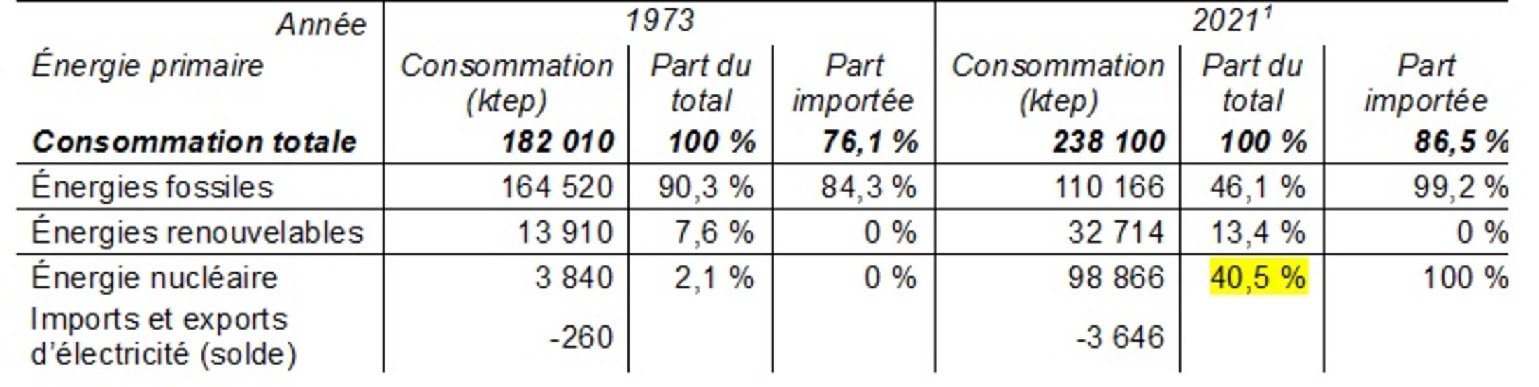 Selon les données officielles disponibles pour les années 1973[18] et 2021[19] les parts des différentes énergies dans la consommation totale d’énergie primaire étaient réparties ainsi :