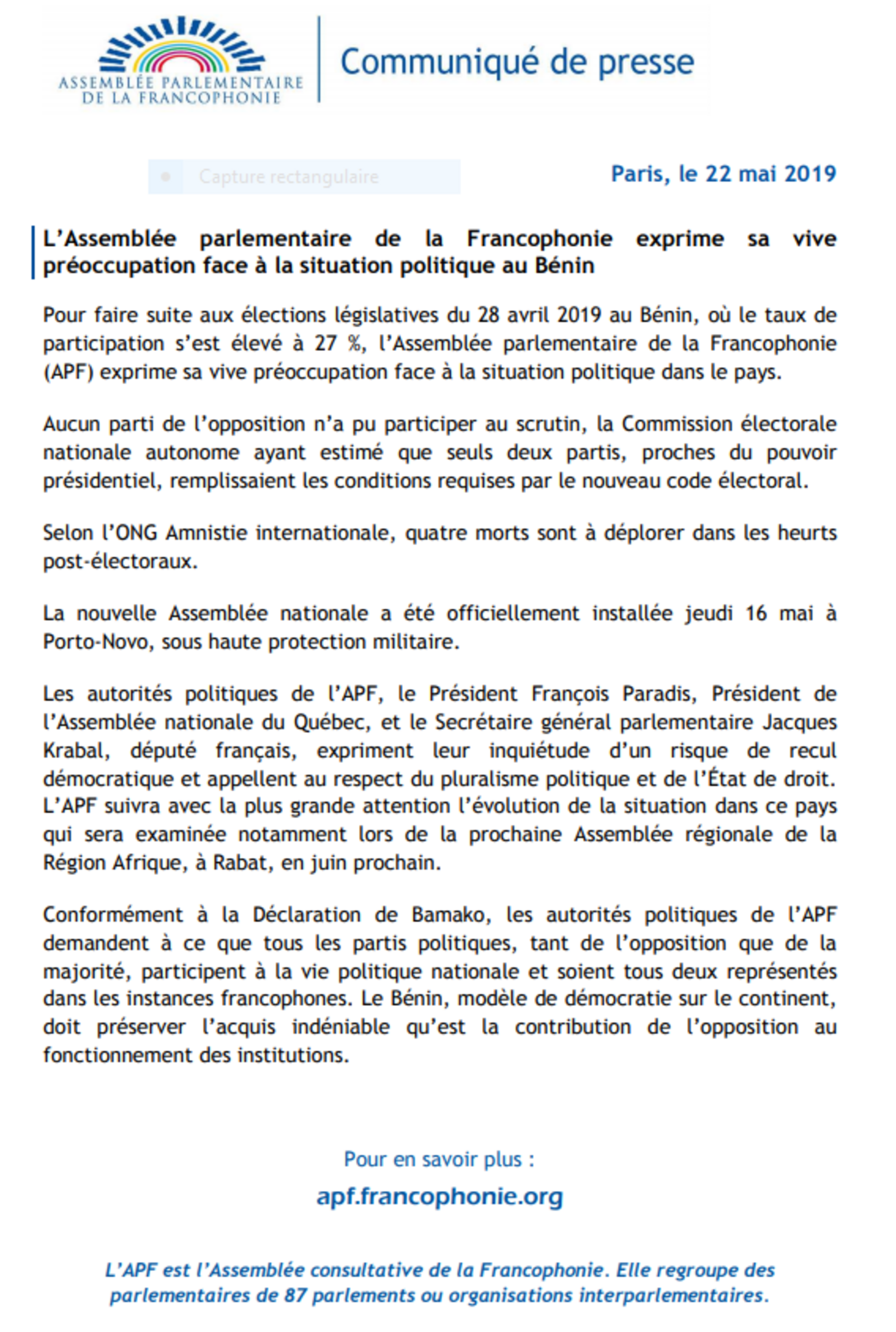 Le Bénin et la Côte d'Ivoire, pays ouest-africains, connaissent de graves crises parlementaires . L'APF, curieusement, dénonce uniquement les violations de la démocratique dans l'un des cas, alors que les mêmes règles sont violées dans l'autre cas, qu'elle préfère ignorer par un curieux principe de non interférence qui cache mal sa complaisance envers le régime Ouattara.