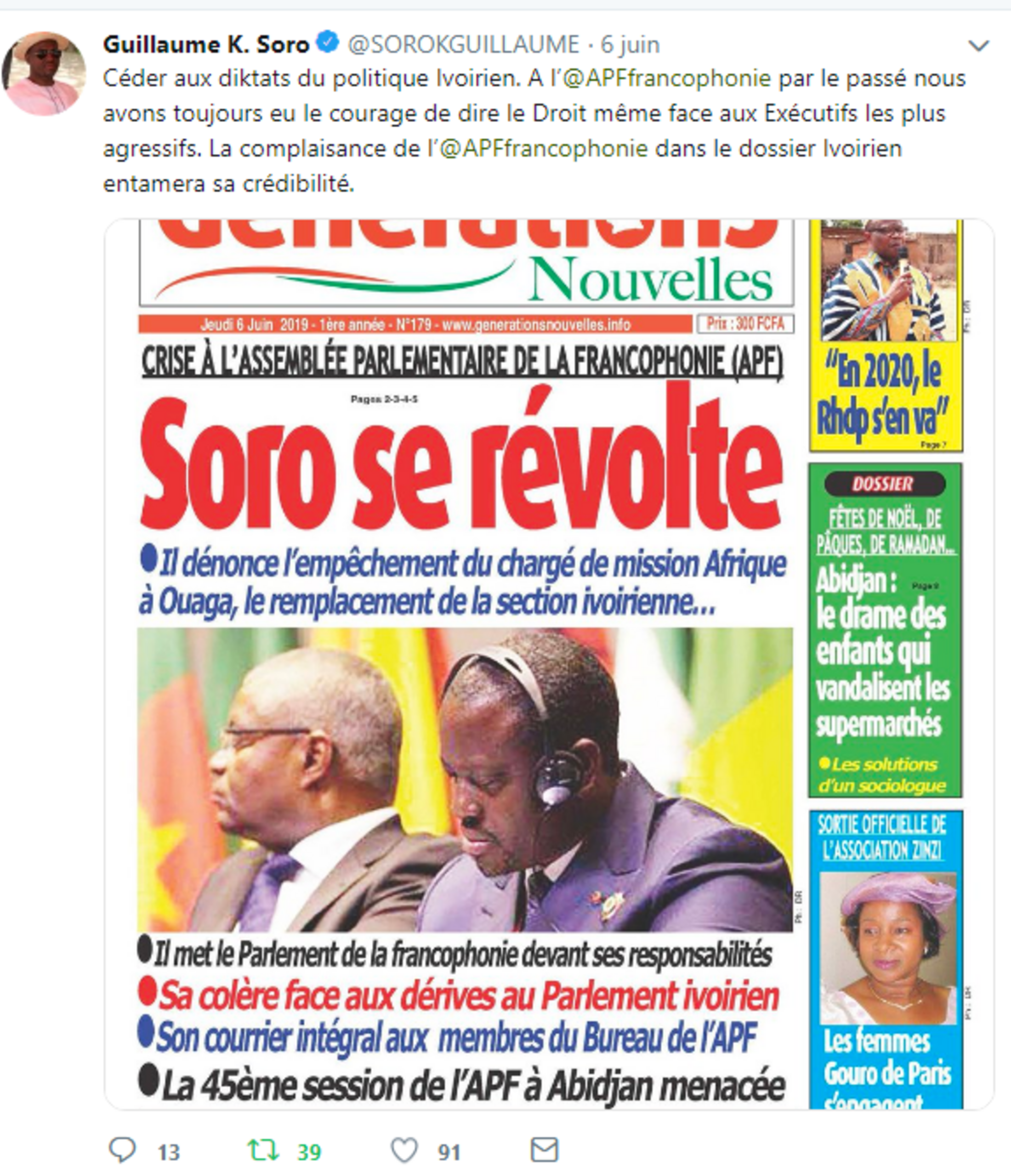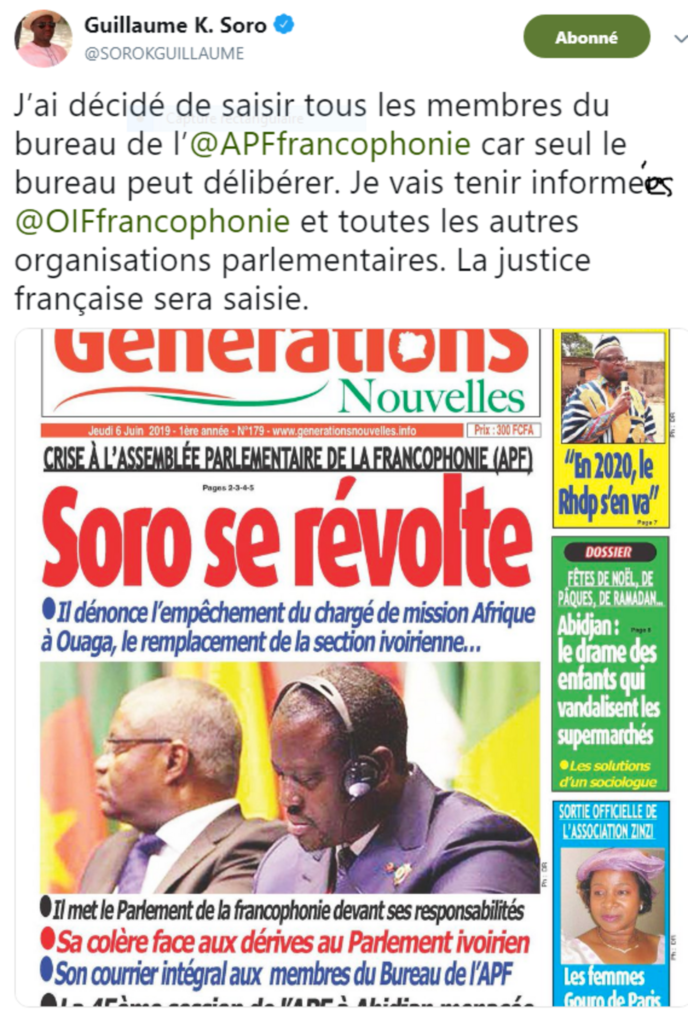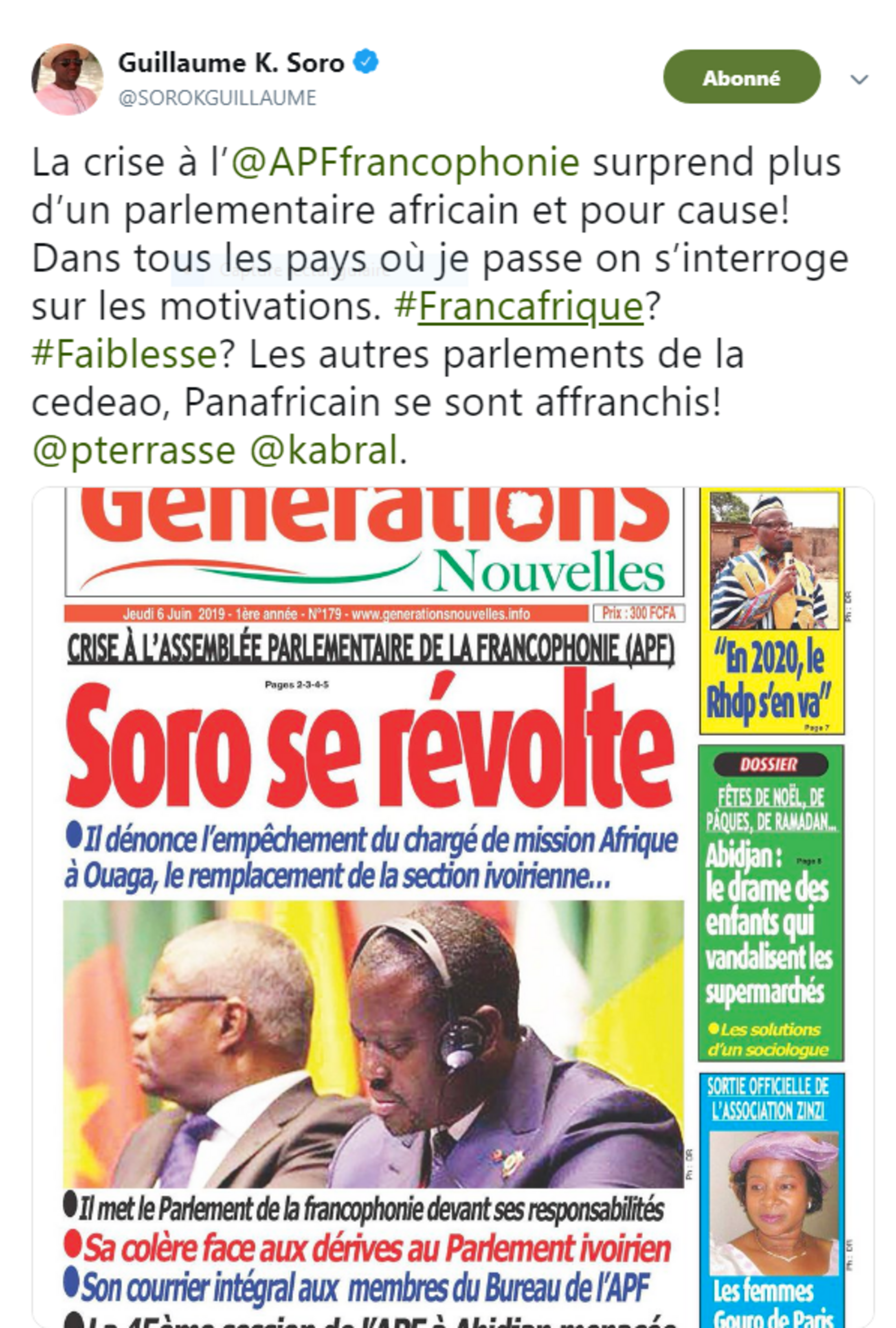 Le Leader ivoirien Guillaume Soro dénonce une forfaiture ourdie par un réseau immoral. Le Président de l'Assemblée Parlementaire de la Francophonie (APF) François Paradis et le Secrétaire Parlementaire de l'APF Jacques Krabal font l'objet d'une vigoureuse dénonciation des parlementaires ivoiriens irrégulièrement et illégalement spoliés de leur représentation dans l'APF par le régime Ouattara.