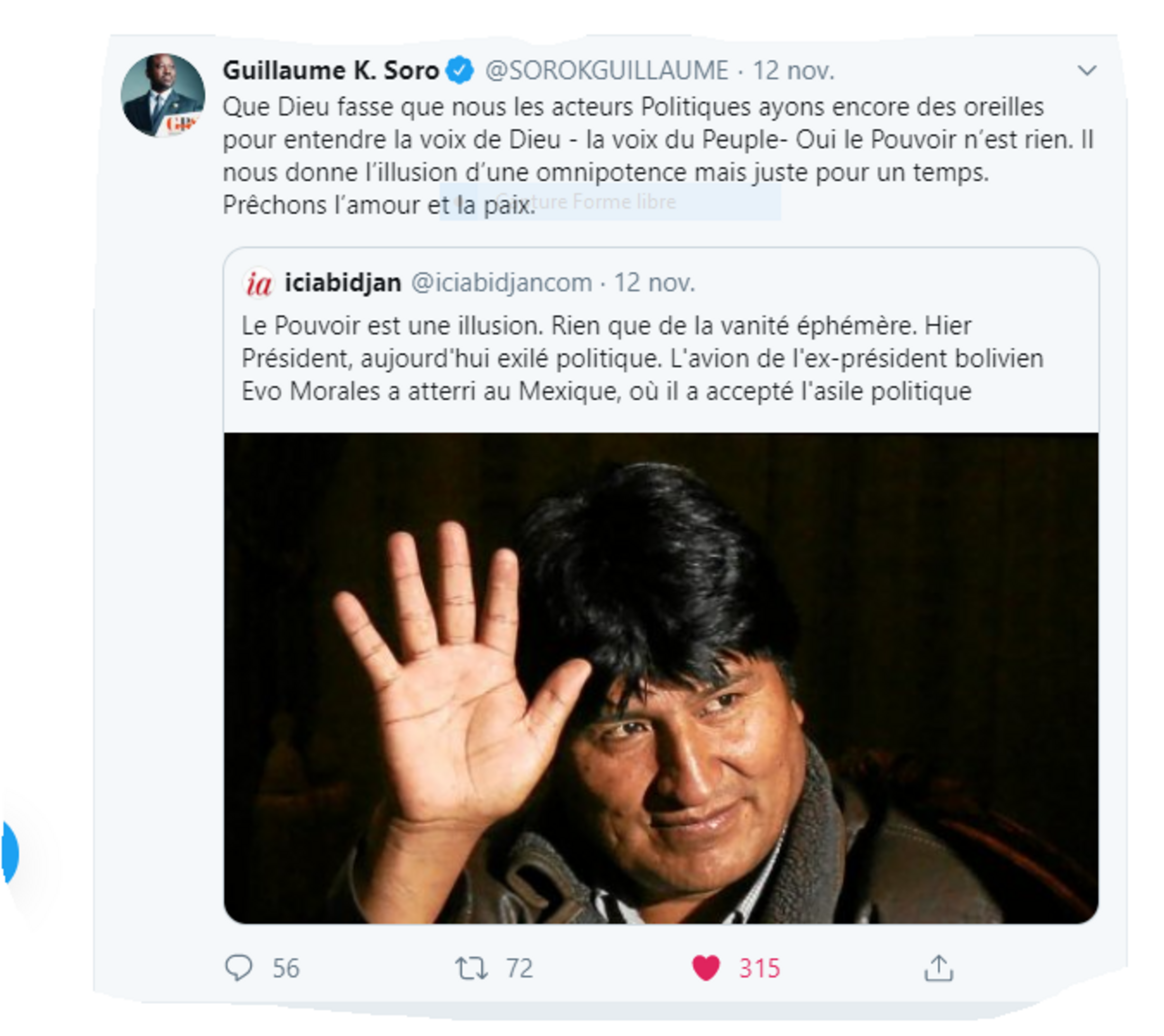 Guillaume Soro délivre un tweet poignant de vérités aux Hommes Politiques africains après la Chute d'Evo Morales. Et si au fond, c'était pour Ado Morales?