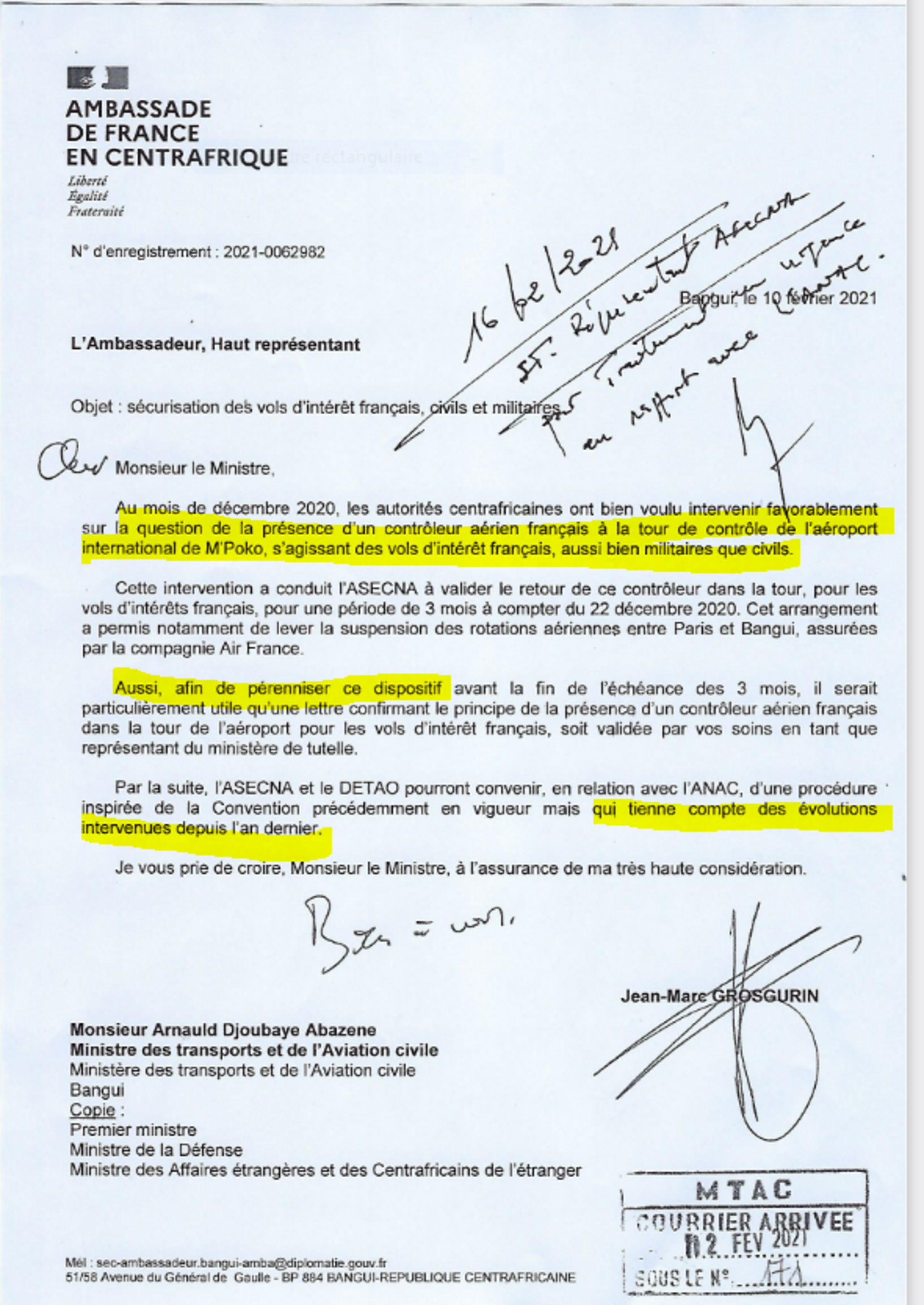 NOUS publions ici les pièces à conviction d'un scandaleux chantage imposé aux autorités aéroportuaires centrafricaines à Bangui par l'Ambassadeur français Jean-Marc GROSGURIN et les Forces Françaises basées au Gabon, pour dicter la présence permanente de contrôleurs militaires français dans la Tour de Contrôle de l'Aéroport de Bangui-Mpoko! Affaire en cours depuis mars 2020 !
