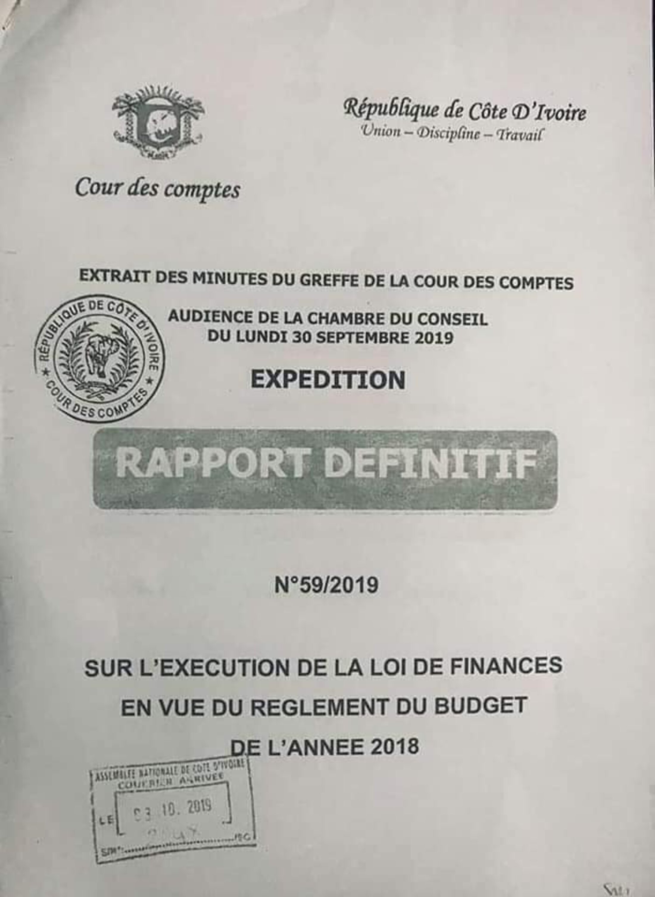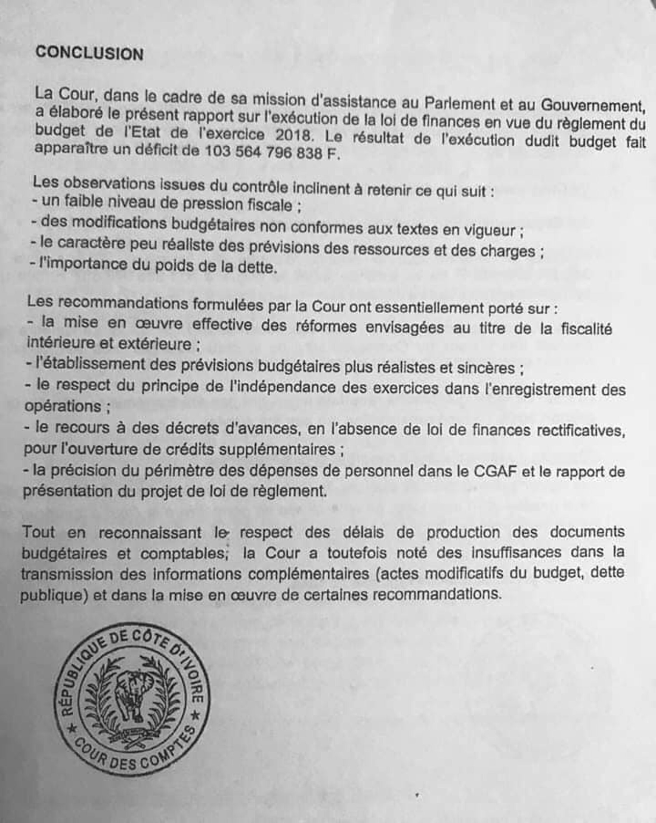 Alors qu'il se faisait passer dans l'opinion mondiale pour un technocrate rigoureux et exemplaire, Alassane Dramane Ouattara vient d'être démystifié par un rapport cinglant de la Cour des Comptes en Côte d'Ivoire. Un grave déficit de 103 milliards, 564 millions, 838 FCFA vient d'être révélé. Lisez scrupuleusement le rapport 2019 ci-dessous.