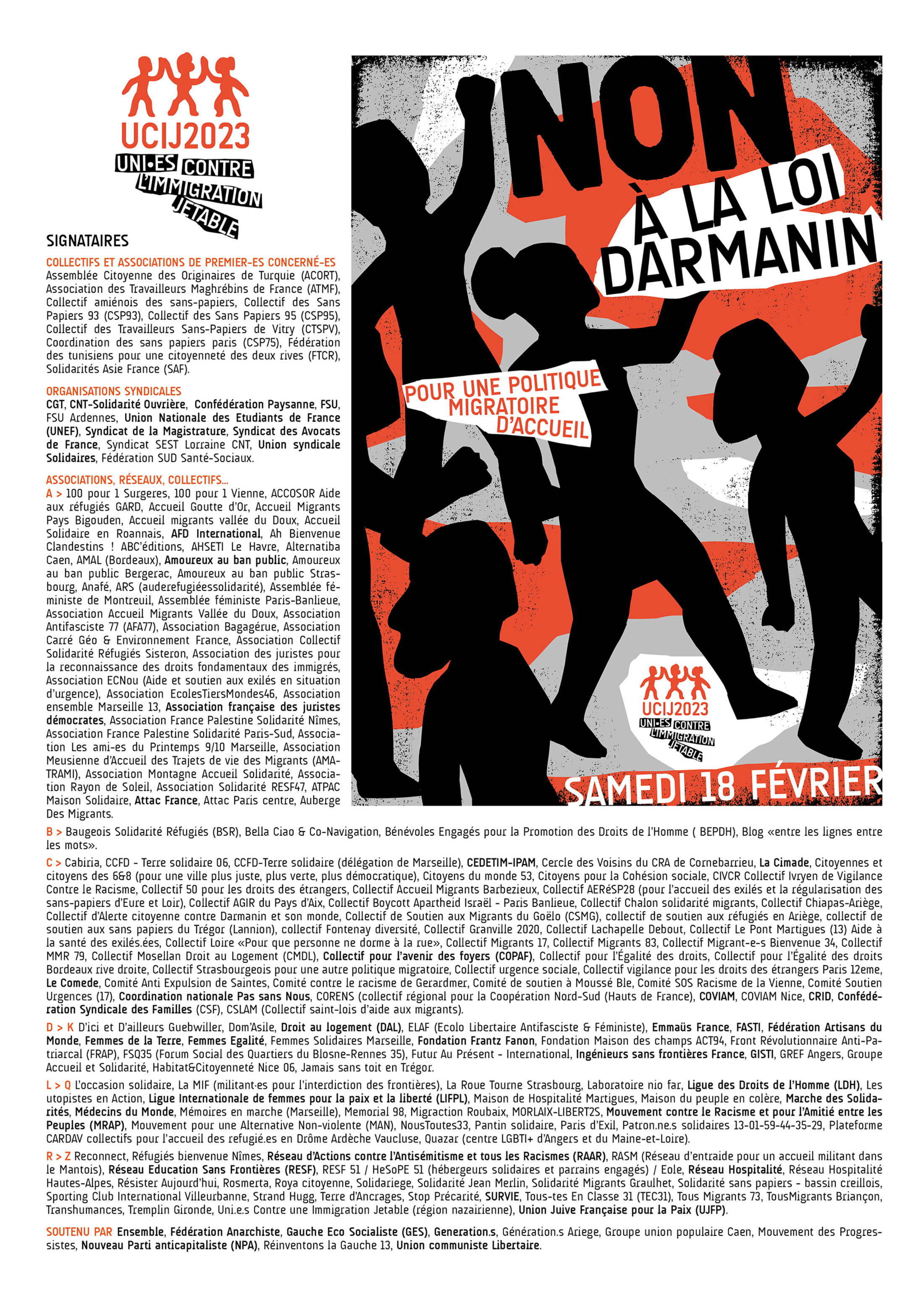 Affiches, visuel et tract pour UCIJ2023 : UNI·ES CONTRE L’IMMIGRATION JETABLE.