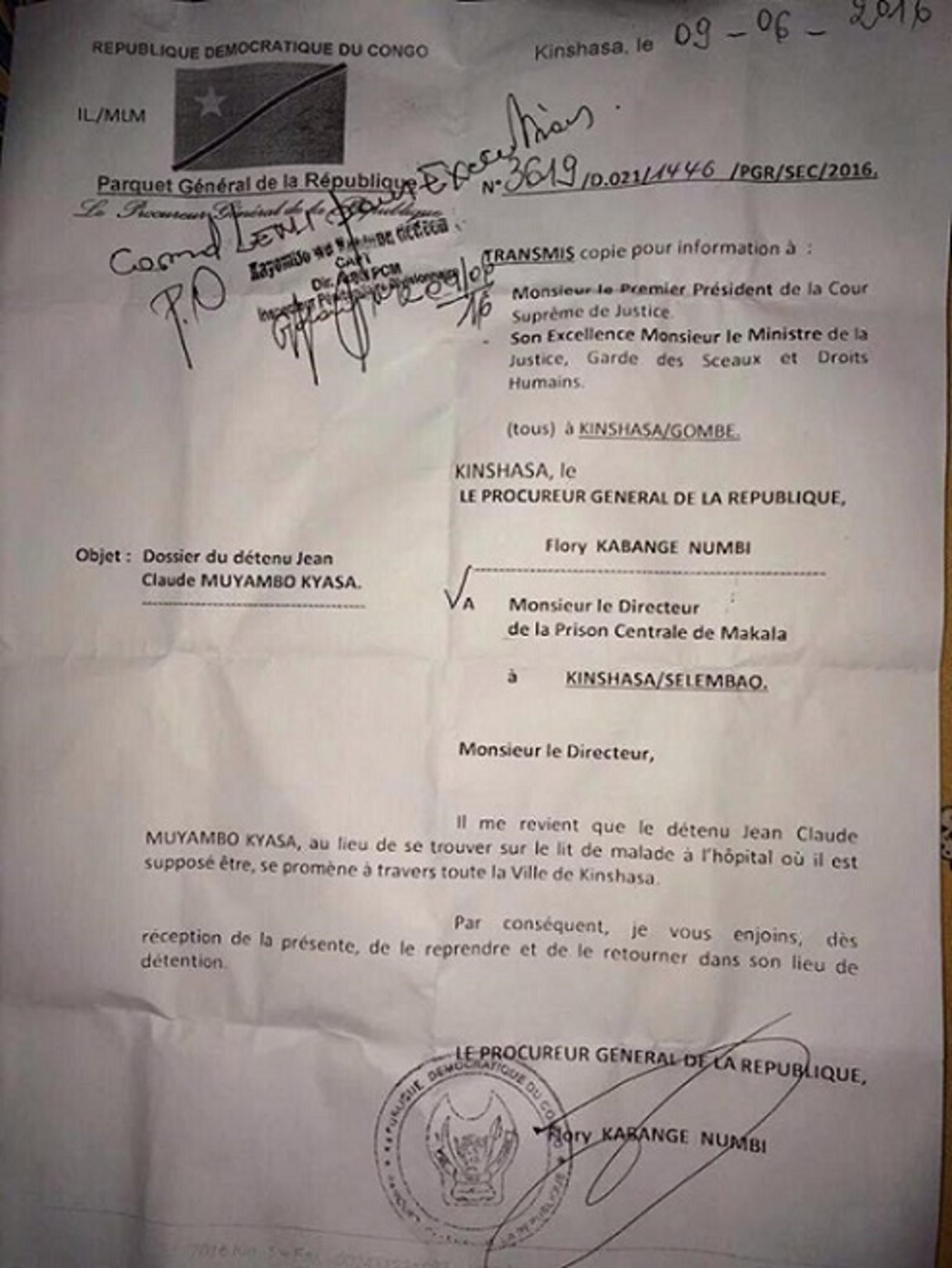 Dans une lettre datée du 9 juin, Flory Kabange Numbi écrit que "le détenu Jean-Claude Muyambo, au lieu de se trouver sur son lit de malade, se promène à travers toute la ville de Kinshasa "