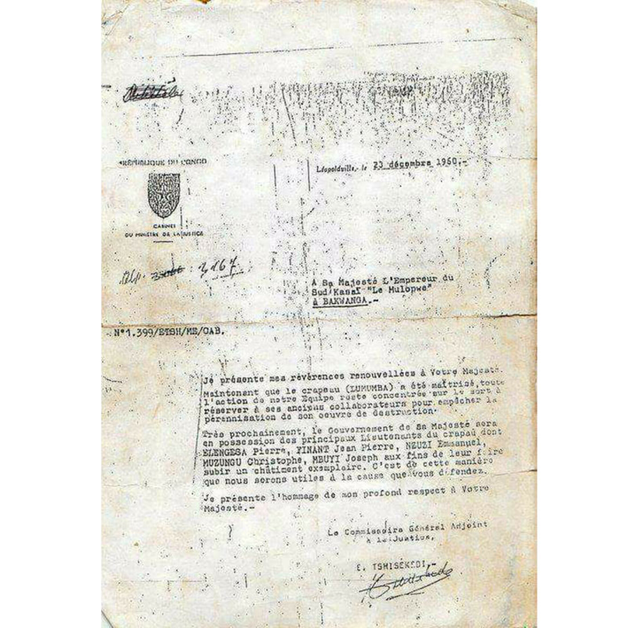 Je présente mes révérences renouvelées à Votre Majesté Maintenant que le crapaud (LUMUMBA) a été maîtrisé, toute l’action de notre Equipe reste concentrée sur le sort à réserver à ses anciens collaborateurs pour empêcher la pérennisation de son oeuvre de destruction. Très prochainement, le Gouvernement de Sa Majesté sera en possession des principaux Lieutenants du crapeau dont Elengesa Pierre, Finant Jean Pierre, Nzuzi Emmanuel, Muzungu Christophe, Mbuyi Joseph aux fins de leur faire subir un châtiment exemplaire. C’est de cette manière que nous serons utiles à la cause que vous défendez. Je présente l’hommage de mon profond respect à Votre Majesté.