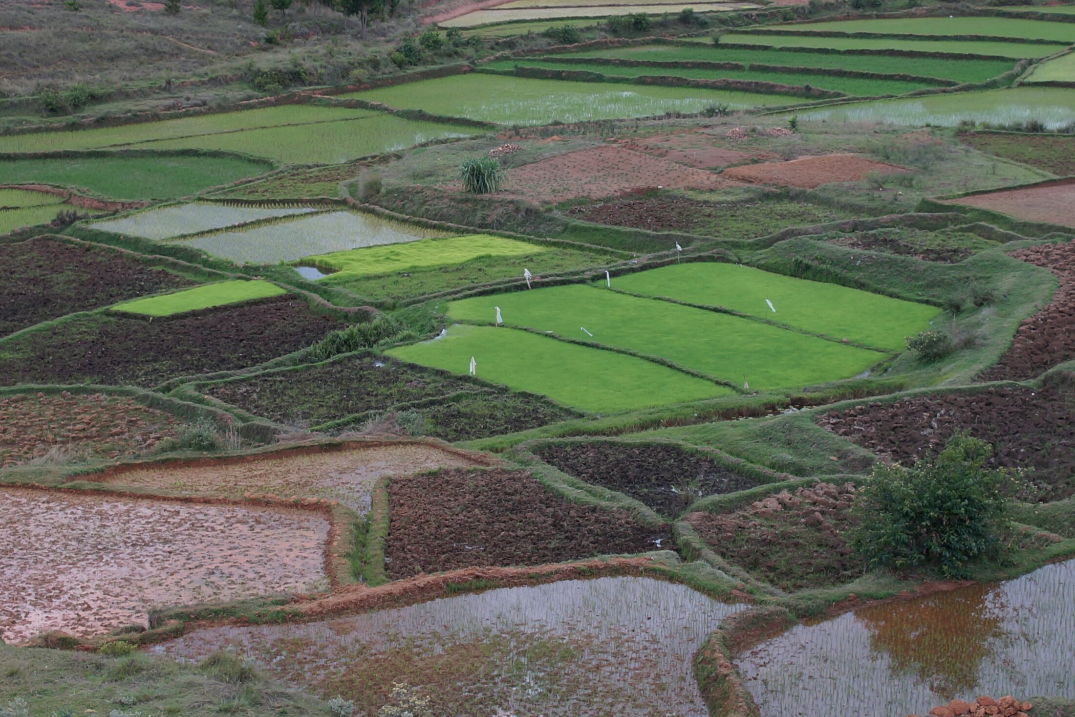 Les paysages rizicoles sont très variés: rubans de rizières tapissant les fonds de la vallée, gradins étroits à flanc de versant, parcelles rectangulaires quadrillant les plaines...les paysans malgaches réalisent des prodiges pour s'assurer la maîtrise de l'eau dont ils redoutent le déficit comme l'excès.
