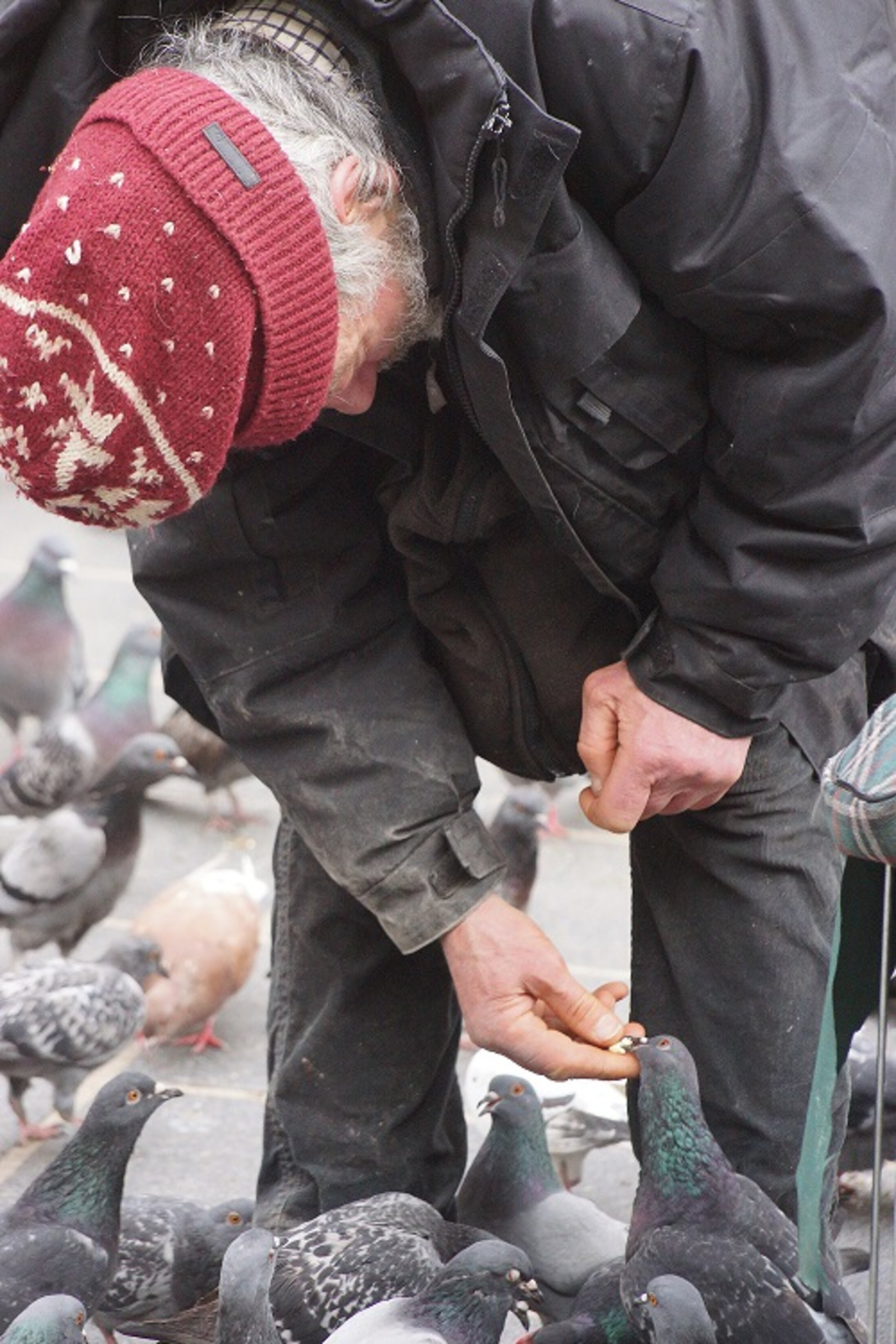 Il est 16h hier samedi 28 mars 2015, lorsque Guiseppe Belvedere apparaît avec ses deux caddies place Beaubourg; tout de suite, il est envahi par ses amis: les pigeons ! Le parvis s'est métamorphosé en un tapis d'oiseaux survoltés. Ce monsieur est devenu une institution du quartier et surtout, Paris sans pigeons n'est plus Paris!» Depuis dix ans, Guiseppe Belvedere fait trois tournées par jour pour que les pigeons, eux aussi, aient une chance de manger. A Beaubourg, il est appliqué à insérer à même le bec une boulette de brioche «meilleure que le pain blanc».