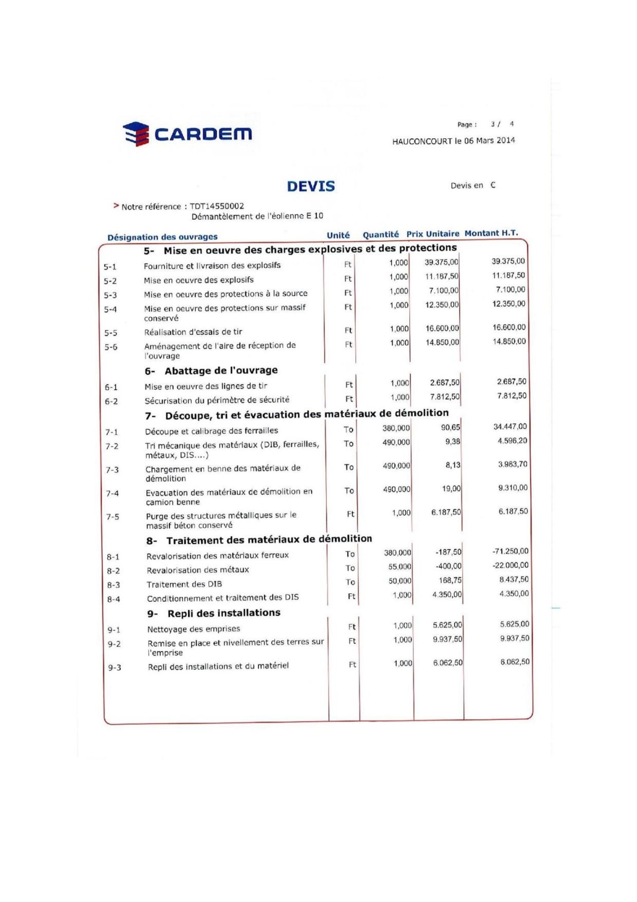 Les mairies qui acceptent les installations des éoliennes auront-elles les moyens de démantèlement des "Mastodontes monstres d'acier" ? Pour exemple ce devis qui date de 2014 est évalué à 413.781,78 euros. Nous sommes en 2020 !