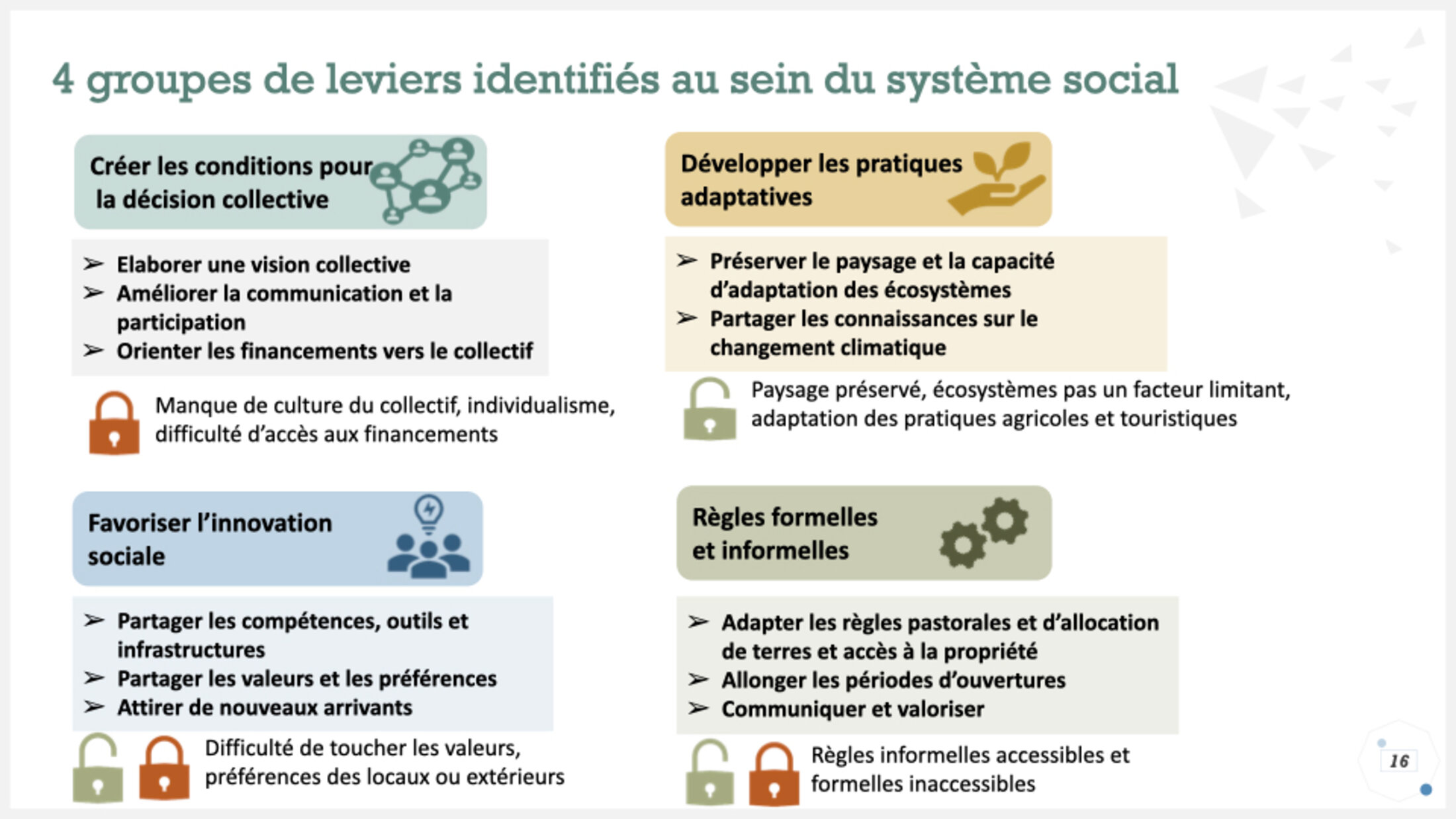 Directrice du laboratoire d'écologie alpine de l’université Joseph Fournier de Grenoble, Sandra Lavorel est parvenue à un constat semblable, « on ne peut pas étudier la transformation des écosystèmes sans travailler sur les transformations des gens, sur les changements de valeurs qui conditionnent les transformations. » Il faut mettre en place des coordinations entre acteurs, remettre en cause certaines structures institutionnelles et politiques publiques qui rigidifient les capacités d’adaptation, mobiliser en même temps les savoirs des gens et des scientifiques, créer des structures de délibération et d’arbitrage. « Soit on ne change rien, on maintient alors le système, c’est-à-dire qu’on entre en résistance, ce qui induit des trajectoires de dépendance. Soit on se dirige vers un changement graduel, marginal pour le système, mais important pour les acteurs concernés. Ou alors on prend un modèle de transformation, c’est-à-dire un processus de long terme avec des changements structurels et de nouvelles pratiques, des changements des valeurs et de la gouvernance. » Il n’y a pas d’outil magique pour s’engager dans l’une ou l'autre façon, si ce n’est l’ouverture aux solutions particulières. Sandra Lavorel travaille en montagne, qui est prise entre la tradition de l’agriculture des alpages et l’industrie du ski. Celle-ci veut toujours aller plus haut, pour compenser la diminution de l’enneigement, ce qui n’est pas une bonne réponse du point de vue de l’environnement. Il s’agirait de trouver d’autres formes de tourisme, plus adaptées à une montagne qui change. « Les acteurs locaux s’organisent pour établir une offre quatre saisons, une éducation à la nature tout en promouvant le patrimoine culturel, » sur le modèle, entre autres, des parcs naturels régionaux (PNR).