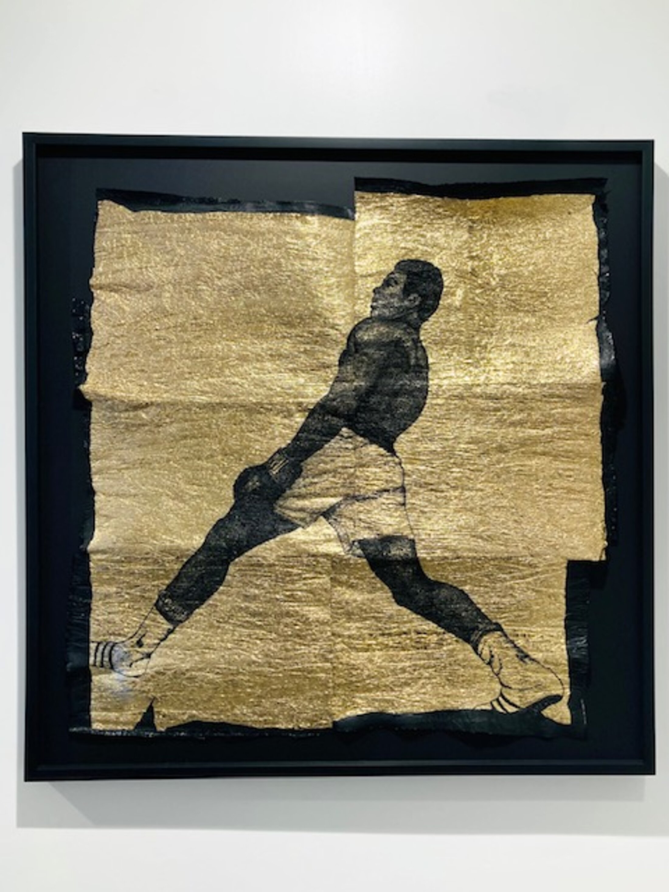 Hommage aussi à Mohamed Ali (Cassius Marcellus Clay), à qui il doit son prénom. Sur matière dorée.