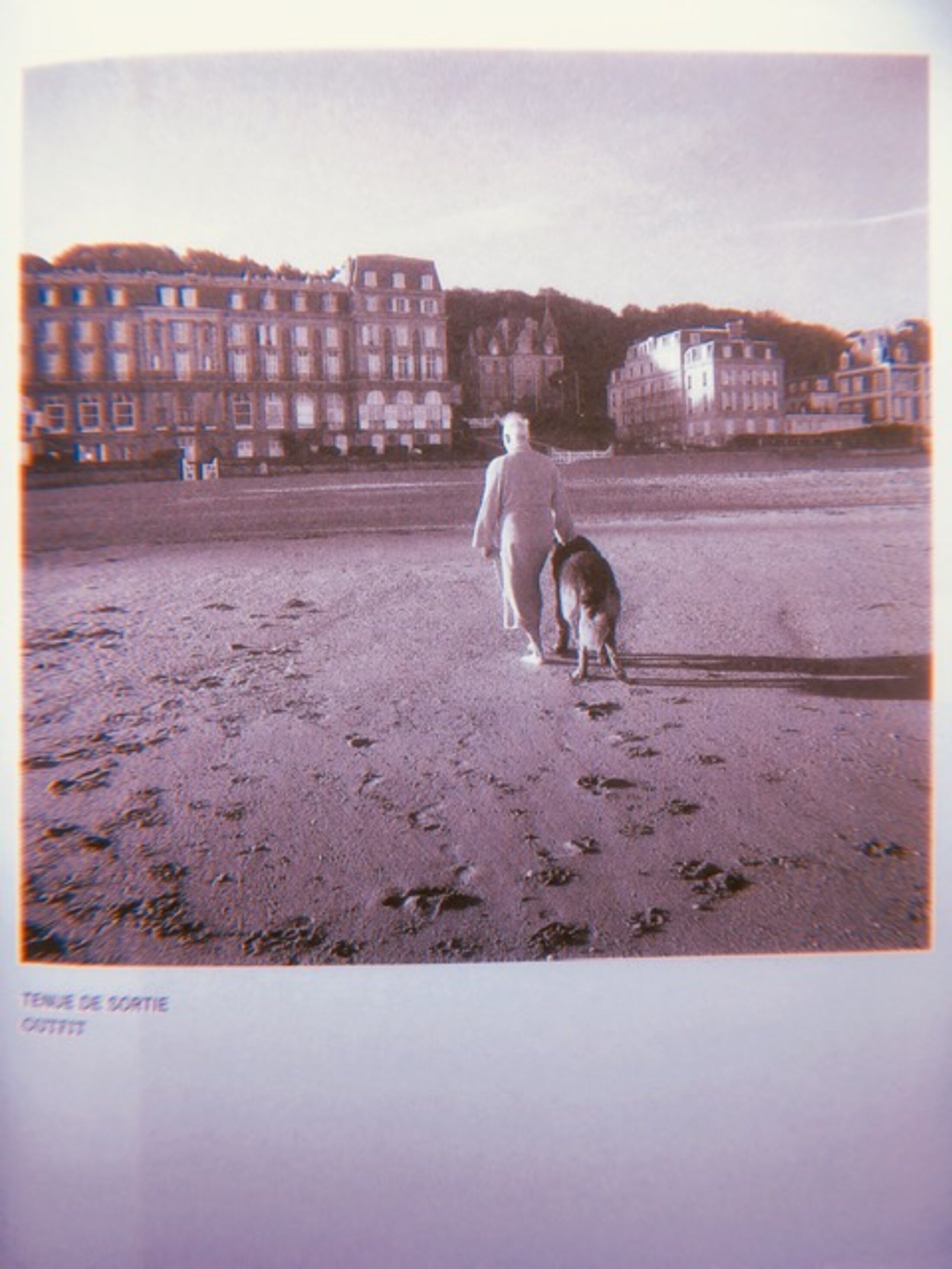 Allure aristocratique un rien surannée, le gentleman en robe de bain semble inspecter son domaine, indifférent aux regards. Question d’éducation, certainement. Vient-il de piquer tête vivifiante dans la Manche, discipline militaire, avec son vieux berger allemand posté en vigie pattes dans la flotte ? S’aèrent-ils tous deux les bronches, rituel matinal immuable, avant la déferlante des tongs et des shorts flashy ? "Tenue de sortie" dit le titre. Pas altier capturé en noir et blanc, dos droit comme s’il portait complet, soutien d’une bête âgée qui a perdu de sa superbe, le promeneur d’un autre temps rejoint pieds nus son appartement-musée, situé dans l’une de ces splendides demeures en bord de mer qui renvoient au glorieux passé trouvillais. La villa Topsy, la villa Honoré et ses briques multicolores, la villa Roy toute de rose vêtue et même l’insolite tour Malakoff avec ses airs de château de conte posé à même le sable viennent à l’esprit; les masures normandes excentriques tendance famille Adams aussi apparaissent sans être sur le cliché. Peut-être a-t-il un jour croisé ici même, ce monsieur, une petite dame prénommée Marguerite, emmitouflée dans de grands foulards et un châle ? Elle aimait paraît-il, sortant des Roches Noires voisines, humer les embruns marins dès potron-minet. Elle aura tapoté le flanc de l’animal encore vif alors, demandé, urbaine, le nom du compagnon puis sera repartie en direction de la mer, solitaire et pensive. « J’ai échangé avec Elle », déclarera-t-il d’un ton faussement nonchalant en franchissant le seuil. « Elle avait bonne mine. » Snobisme exquis.