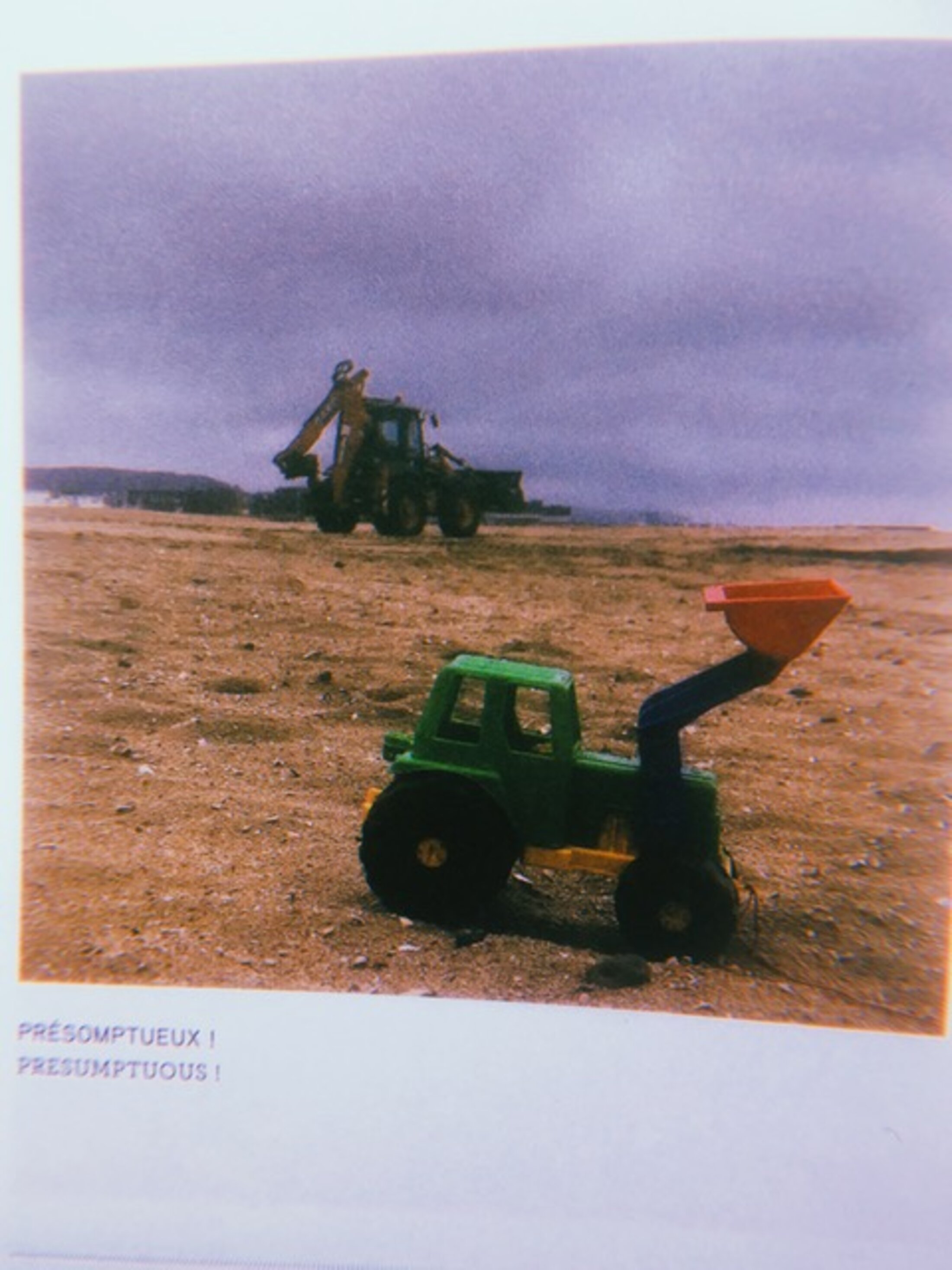 La reine Elizabeth avait obtenu dérogation pour "écumer" les célèbres planches à bord de sa Rolls Royce. Elle n’a guère vu grand-chose sans doute. Birenbaum prend le contrepied de Lizbeth et se concentre sur le détail, l’incongru, l’émouvant; le prestige du décor se fondant dans l’arrière-plan, derrière les intentions humaines saisies à la volée. Qui a sauté dans un train à St Lazare ce matin, saisi par le besoin impérieux de sniffer de l’iode (ou de claquer au casino, allez savoir) ? Qui vit ici à l’année et profite d’un jour de repos pour travailler son bronzage ? Touristes et locaux se mélangent, grands bourgeois et prolos se côtoient sans drame et Guy Birenbaum enjambe la Touques dans les deux sens, appareil au cou, gourmand de moments vrais. Jedi le clebs se soulage façon rebelle; une demoiselle s’Instagramise ("Moi, Moi, Moi"); les nationalités, les origines disparaissent une fois les fripes retirées; le Christ se coltine la mer toute la journée, ça vire calvaire et Woody Allen surgit à travers une citation : « L’éternité c’est long, surtout vers la fin. » Un petit tracteur, jouet orange, au premier plan. Derrière lui un vrai, monstre nettoyeur sans délicatesse, trace chemin. L’enfance et ses rêves, ses jeux mécaniques. « Quand je serai grand... » Pas trop vite, petit. Pas trop vite. Une dame consulte son téléphone sur la plage, serviette sur la tête pour tenir à distance le soleil, indifférente à la dégaine qu’elle présente au monde : "Dans sa bulle"; notifications ou élégance il faut choisir. Ce n’est pas moqueur, ce n’est pas méchant; attendrissant plutôt. Des goélands se bouffent le bec, les Blues Brothers ont laissé une trace et une demoiselle marche le long de la mer un jour de pluie, perdue dans des pensées que l’on s’approprie sans les connaître pourtant.