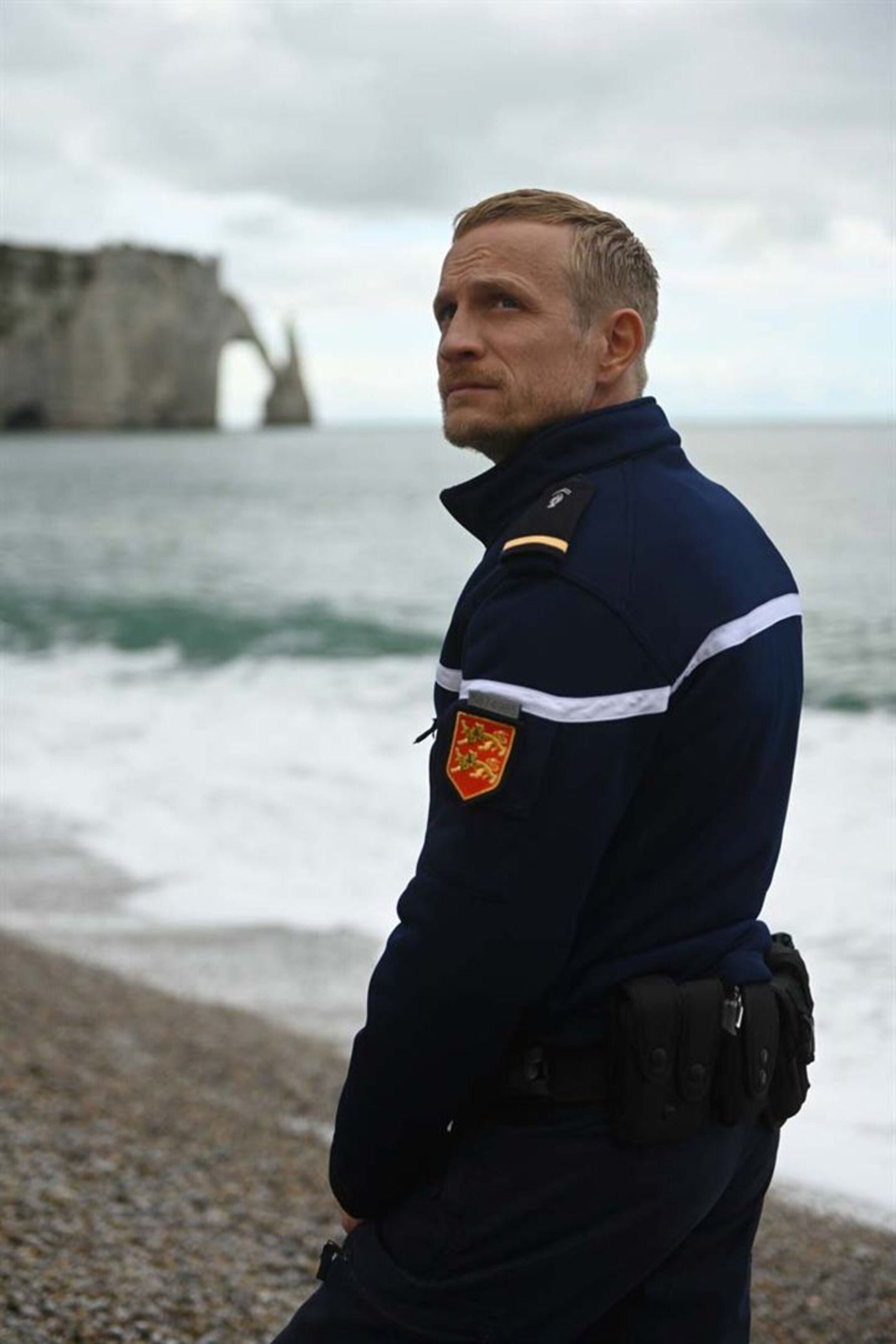 Étretat, automne 2019. Le quotidien d’un sous-officier de gendarmerie : constater le suicide d’un homme du haut des falaises ; remonter les bretelles d’une jeune qui circulait sous l’emprise de cannabis mais sans casque sur son scooter ; remplir de la paperasse ; ramener chez lui un ivrogne qui fait des histoires au bistrot ; démarrer une enquête sur des soupçons de violences sexuelles sur mineurs ; essayer de rassurer un agriculteur au bout du rouleau… Et rentrer chez lui, dans son logement à quelques mètres du « bureau », retrouver sa femme qu’il vient de demander en mariage, et sa fillette de 7 ans. Laurent (Jérémie Renier) totalement au cœur de la société, sait tout de ce qui fait la vie quotidienne de son secteur, Étretat, où même des mariés asiatiques viennent se faire prendre en photo face à l’arche et l’aiguille creuse, sur les galets. Mais tout bascule lorsqu’il tue accidentellement un agriculteur éleveur de vaches qu’il tentait d’empêcher de se suicider. Laurent, sous l’effet de la sidération, se mure dans le silence et ne décroche plus que quelques mots, incapables dans un premier temps de reprendre le dessus. Il finira par essayer de larguer les amarres, sur les traces de son grand-père, terre-neuvas, dans une expédition qui pourrait bien lui être fatale.
