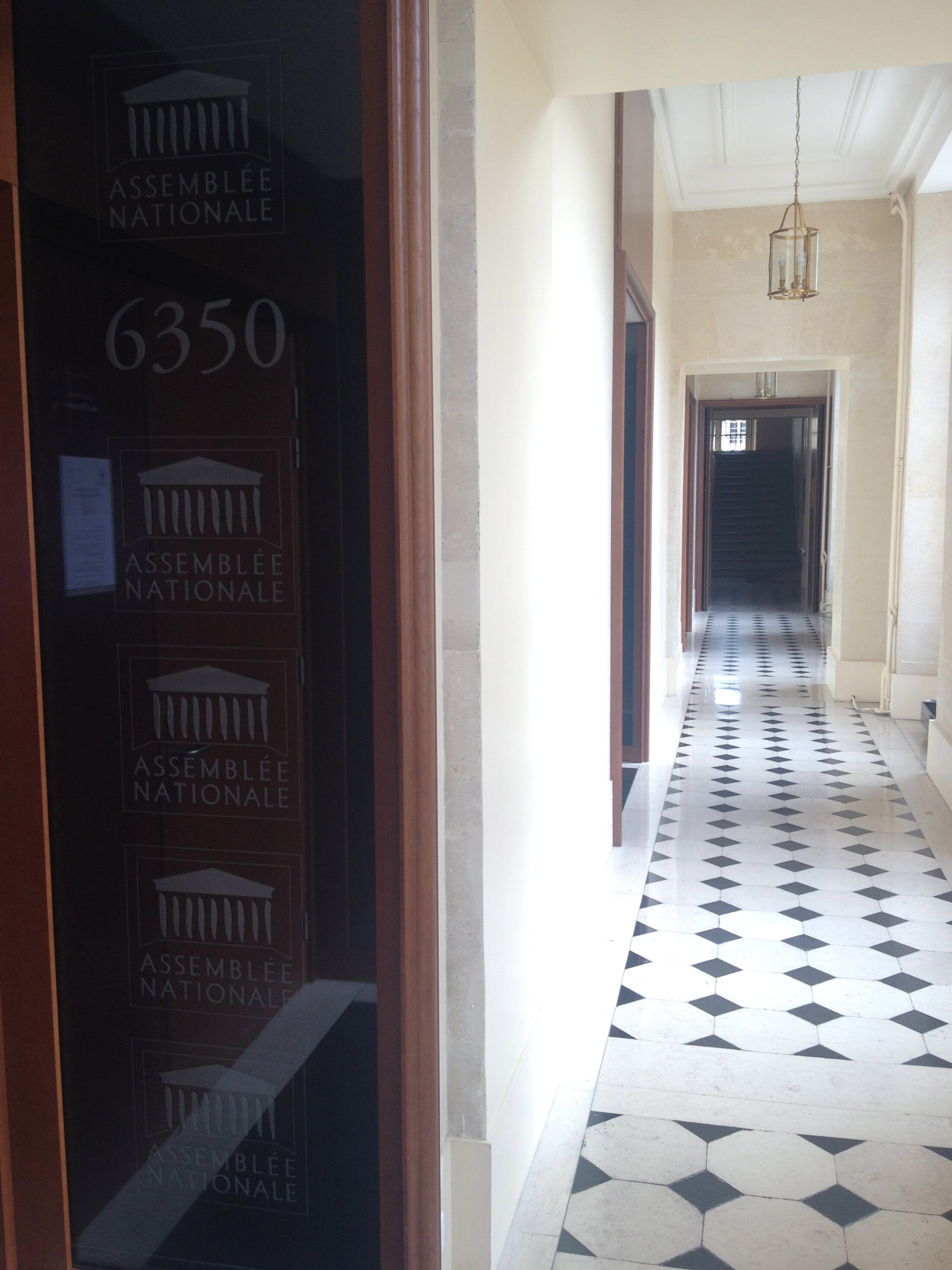 Les couloirs du Palais Bourbon semblent parfois directement sortis de l’imagination de Lewis Caroll ou de Jorge-Luis Borges. Il n’existe pas de chemin linéaire pour visiter ou faire le tour de l’Assemblée nationale. A l'extérieur on en connaît surtout l'hémicycle et la salle des quatre colonnes mais à l'intérieur on y trouve salles de commission, salles de réunion, bureaux de députés, de collaborateurs, de fonctionnaires, deux amphithéâtres, une magnifique bibliothèque, une salle de projection, des studios de télévision, des petits salons pour des rencontres en cercle restreint, deux restaurants, deux cantines, une cafétéria, et même une salle de sport, un bureau de poste, et un coiffeur ! D'une chose à l'autre on passe son temps à l'arpenter de long en large et de haut en bas et pourtant pour rejoindre deux points, il faut toujours se poser la question du « meilleur » chemin à emprunter.