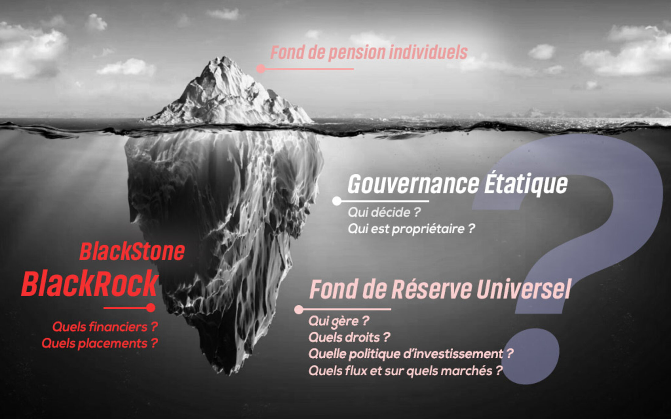 Quoi de plus facile que de nous soumettre, lorsque notre « Fond de Réserve Universel » sera soumis aux lois du marché, au grès des placements, qu’il sera en laisse, sous l’égide de la finance. Ne vous y trompez pas, il ne s’agit pas de quelques économies de gestion ni de faire du profit. On pourra justifier une baisse de coûts qui s’entend, de meilleurs tarifs sur les lignes de dépenses financières à placer nos billes sur des fonds rodés et « fiables ». BlackRock ou tout autre. En réalité, dès lors que TOUTE notre épargne - les Retraites sur le long terme - sera, gérée de façon centralisée et dès lors qu’elle dépendra de tiers, nous ne serons plus SOUVERAINS.
