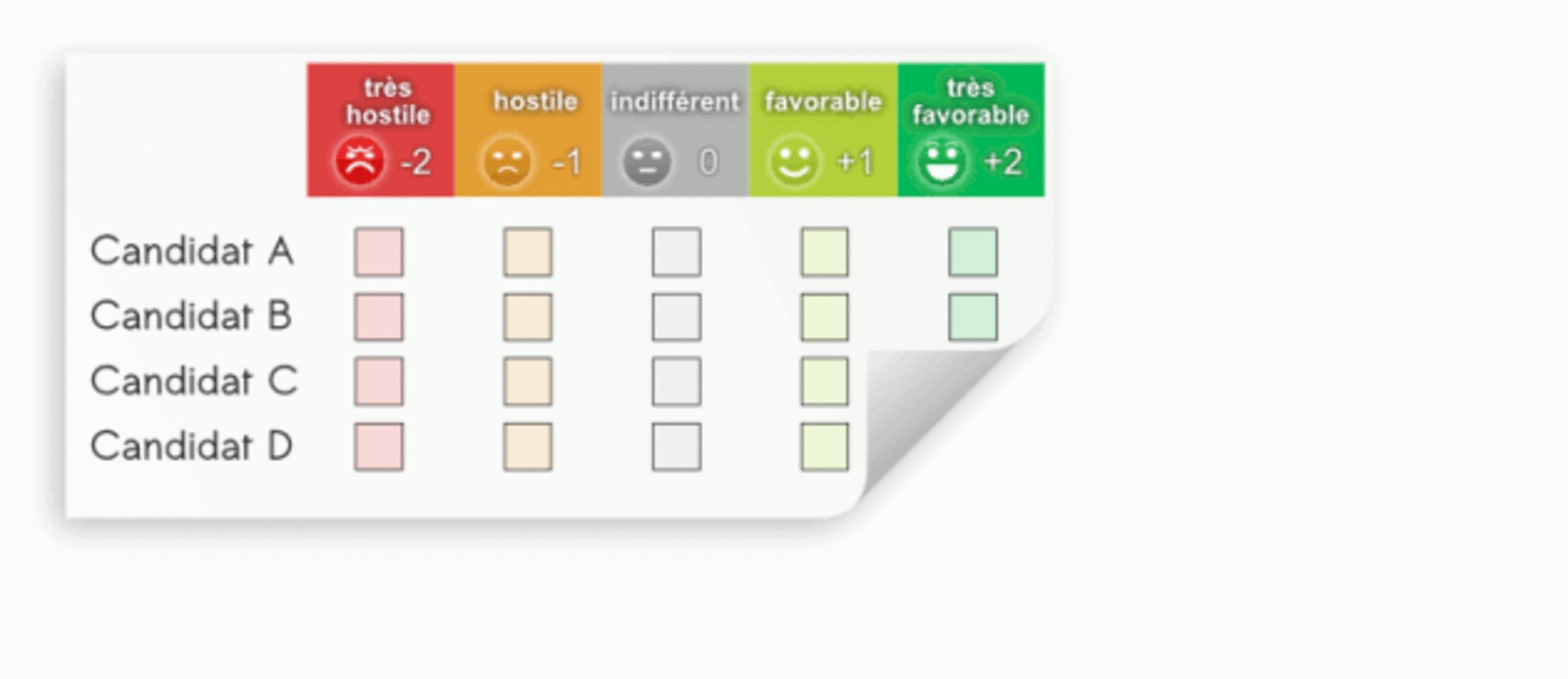 - toute autre "opinion" qui ne peut s'exprimer par un bulletin avec un seul nom dessus est impossible : pas de reconnaissance des votes blancs, des abstentions, des nuls...
