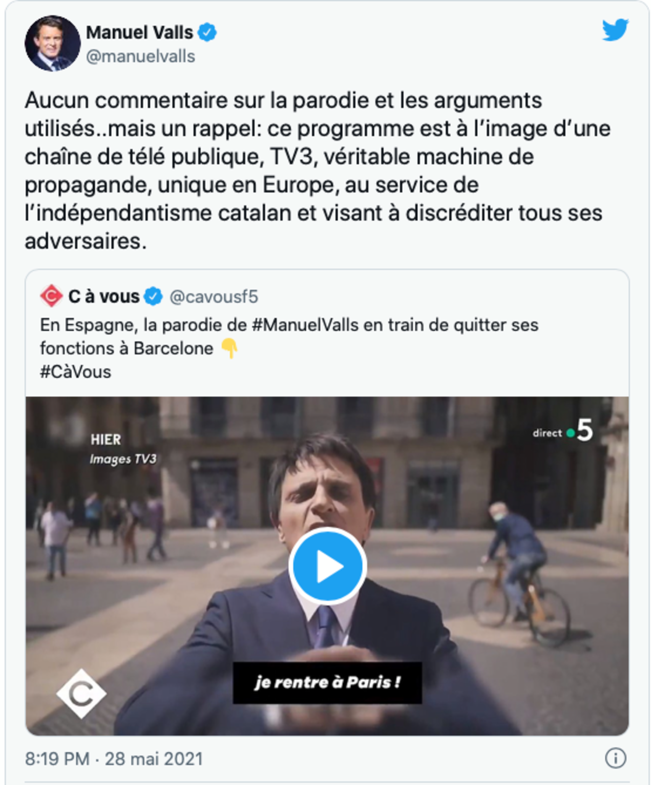" Et si la parodie réalisée par la chaîne publique TV3 sur l'air de "Moi Lolita" pour moquer le nouveau départ de Manuel Valls en France n'était pas si éloignée de la réalité ? ", s'interroge perfidement le HuffPost. 😀